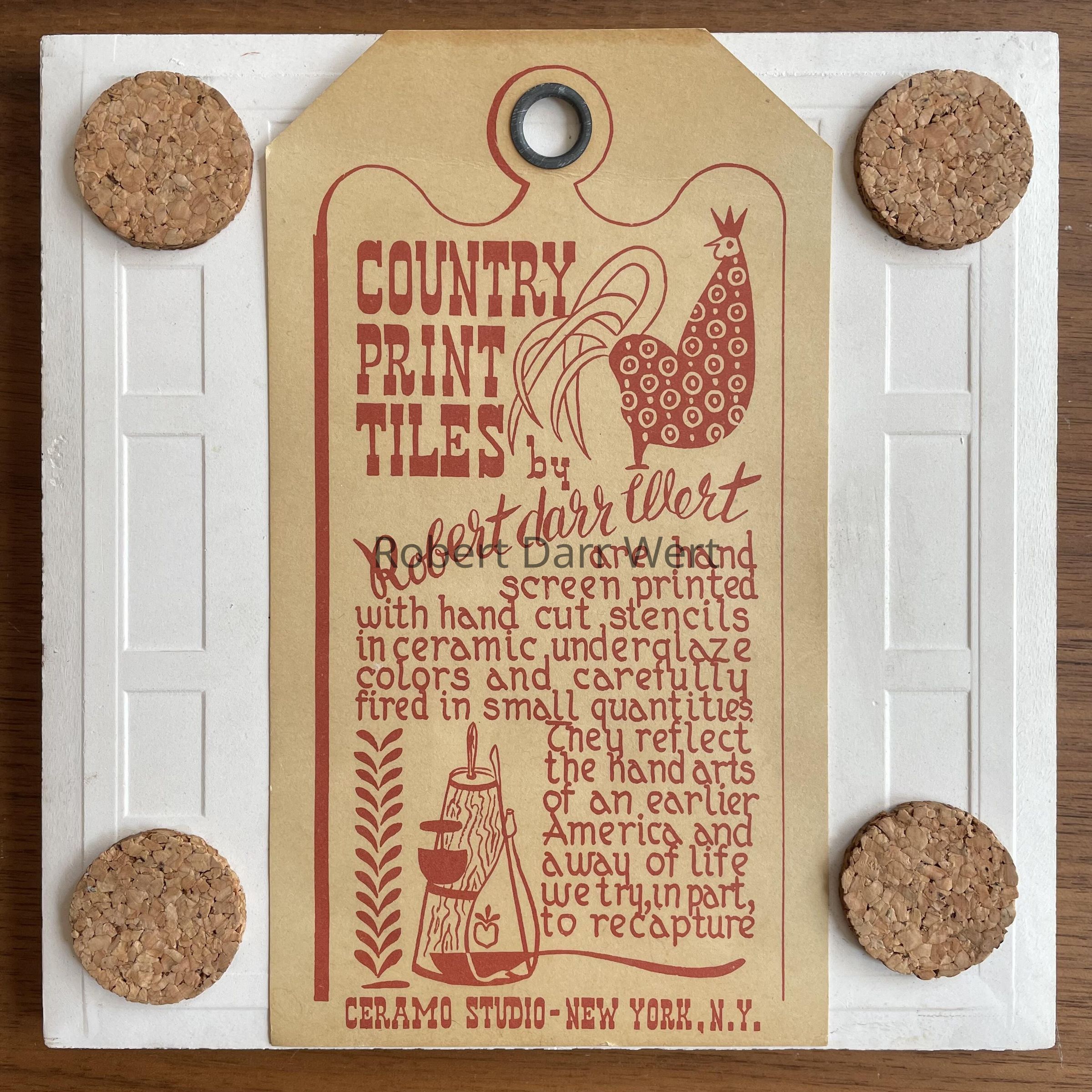This example is printed on the thicker tile body used by Country Prints/Ceramo Studio prior to 1962. Design, screen production, and mixing of colored underglazes performed at the Country Prints workshop, Gill, MA. Screen printing of underglaze colors, clear glaze, firing and finishing by Ceramo Studio, NYC.