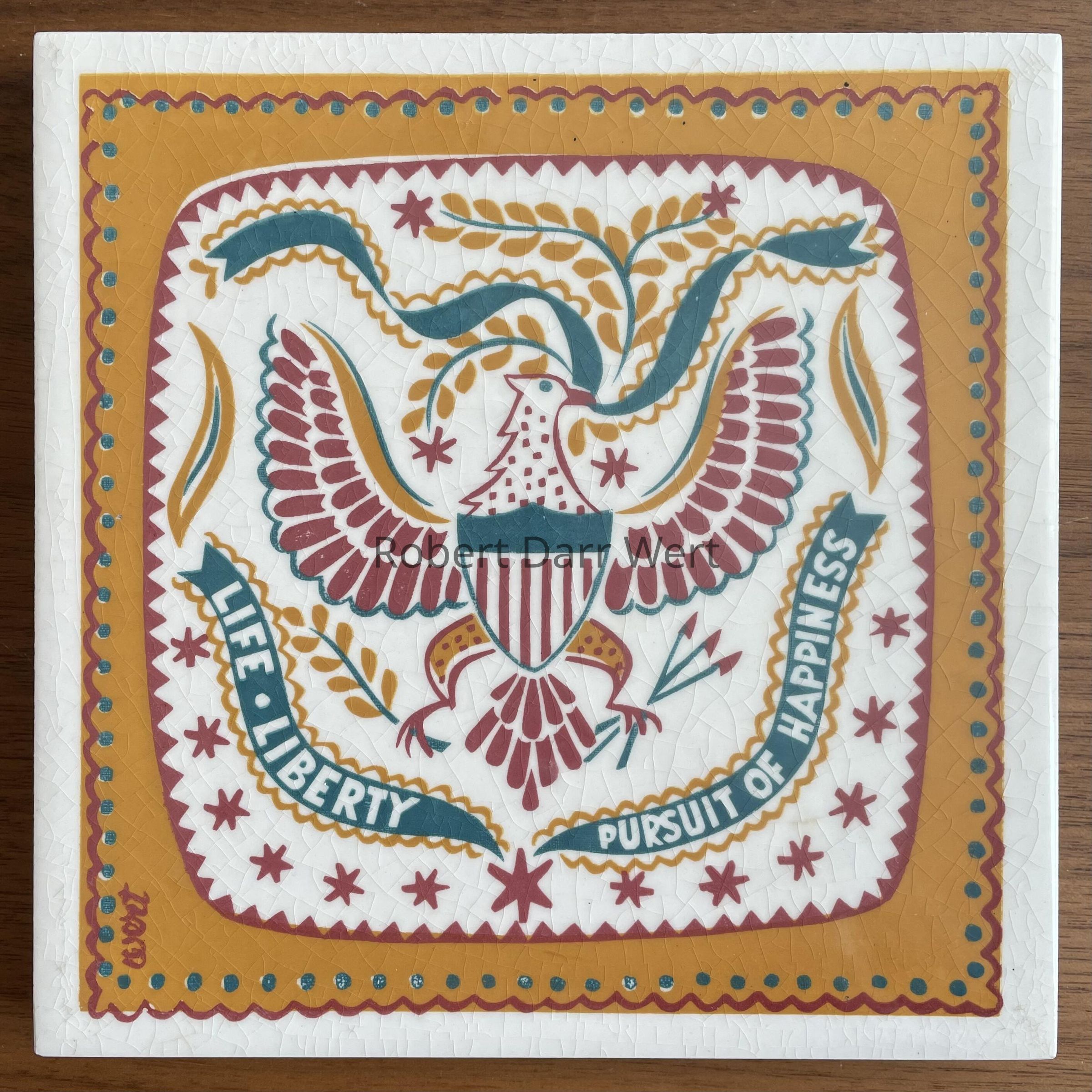 A three-color silkscreen underglaze print on a white tile blank inspired by an early American applique quilt. At center an American eagle with a patriotic chest shield holds a furling banner in its beak. Below, another banner is emblazoned with a partial phrase from the Declaration of Independence, “Life, Liberty, Pursuit of Happiness”. Below are thirteen red six-point stars representing the original thirteen states of the union. This tile appears in the brochure “Robert Darr Wert/Country Prints Tiles”, c.1960; see images.