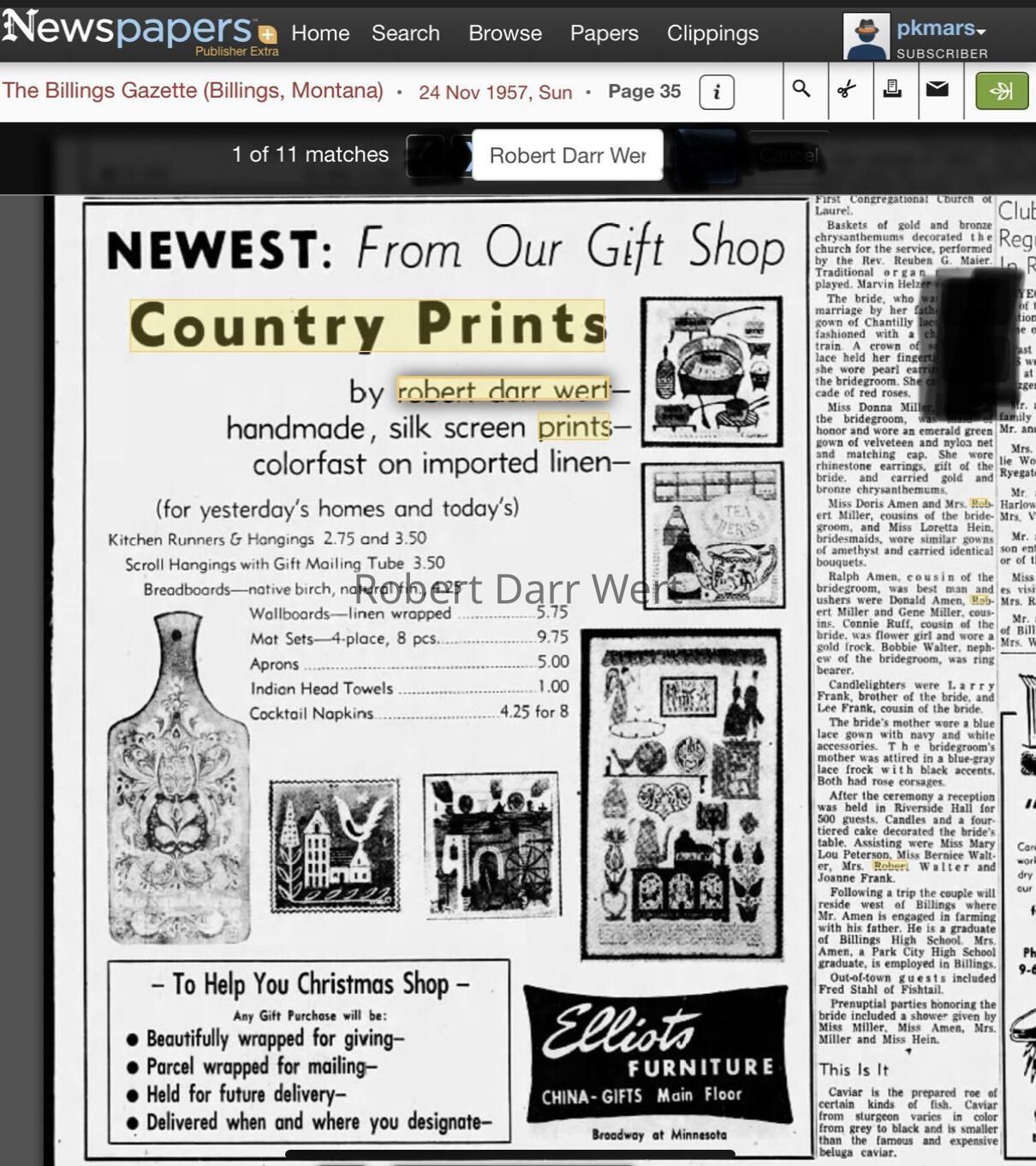 This tile appears in the c.1956 brochure “Country Prints Tiles designed by Robert Darr Wert”, as well as a 1957 ad for Elliots Furniture of Billings, Montana; see images.