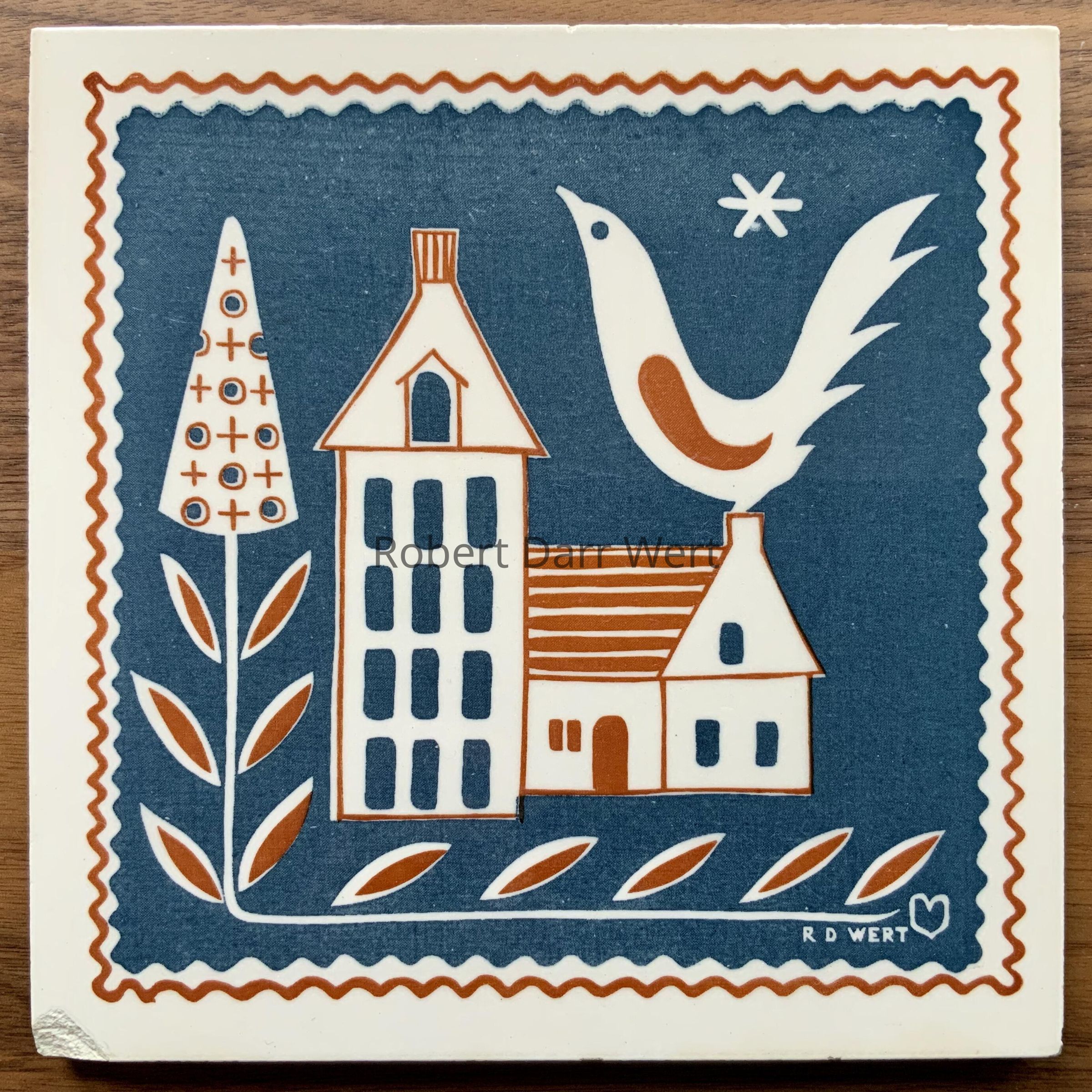 A two-color silkscreen underglaze print on a white tile blank depicting a large bird atop a house, and a trailing vine supporting a manicured tree superimposed with Wert’s interpretation of a calico textile pattern. The composition is framed with a rick-rack style border. It was produced in two colorways, blue and brown; see separate entries.