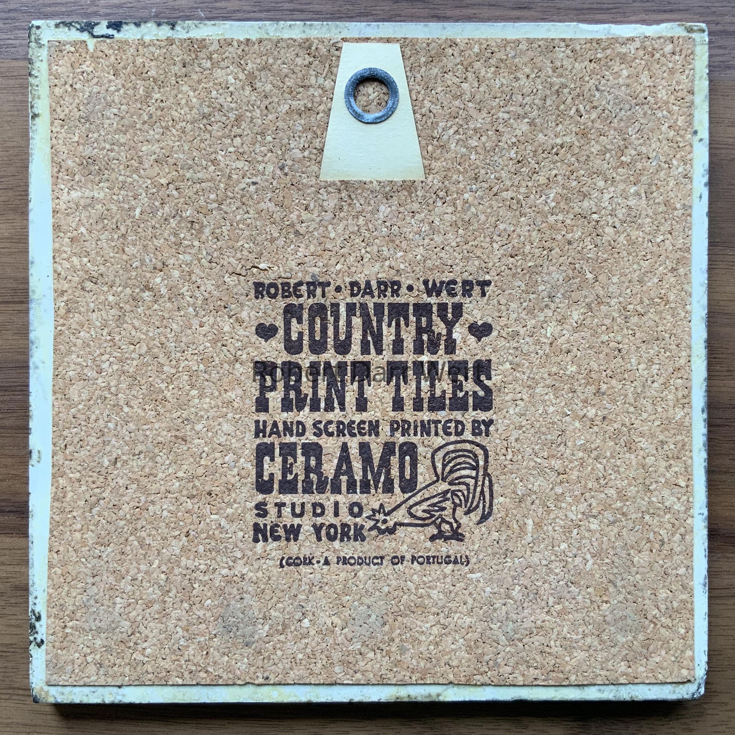 First produced c.1956 and soon discontinued, this tile bears the full cork backing Country Prints/Ceramo Studio began using c.1962, indicating it was reintroduced in the early 1960’s.