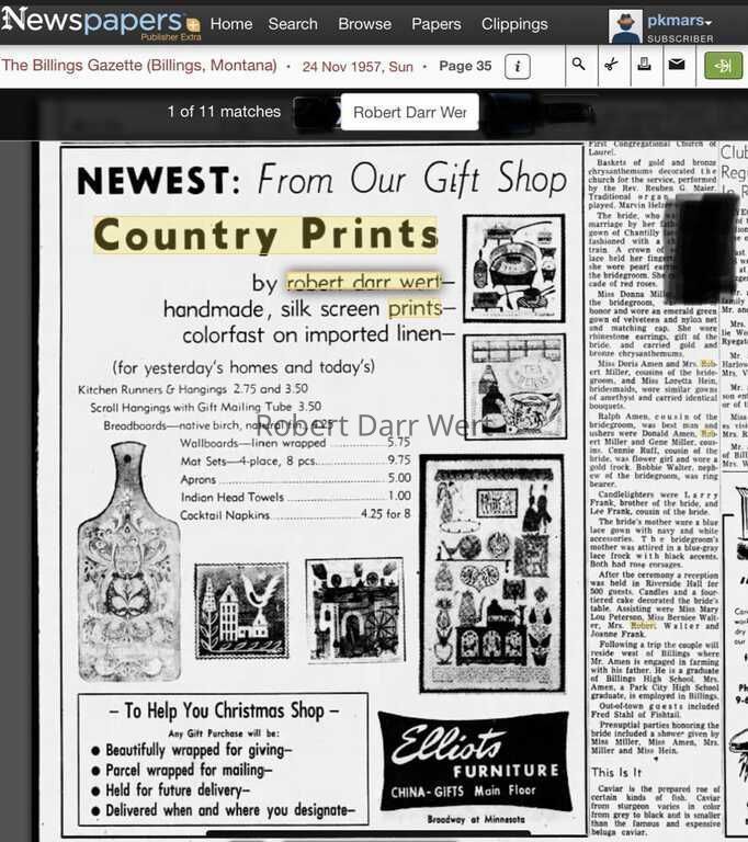 This tile appears in the c.1956 brochure “Country Prints Tiles designed by Robert Darr Wert”, as well as a 1957 ad for Elliots Furniture of Billings, Montana; see images.