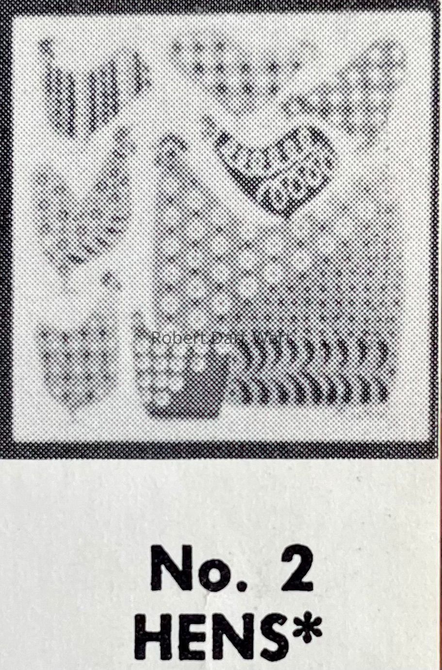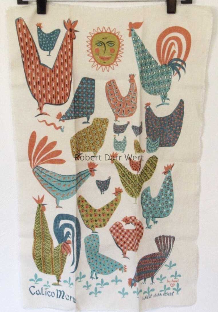 A four-color silkscreen underglaze print on a white tile blank depicting three roosters superimposed with Wert’s interpretation of calico print patterns. This tile appears in the c.1953 brochure “Robert Darr Wert/Country Print Tiles”, and the c.1960 brochure “Robert Darr Wert/Country Prints Tiles”; see images. This c.1953 design was updated c.1954, but then reintroduced to the line c.1960. A matching placemat set and towel/wallhanging were also produced; see images. Roosters T-2 is a pair with Hens T-2 (TK); see images.