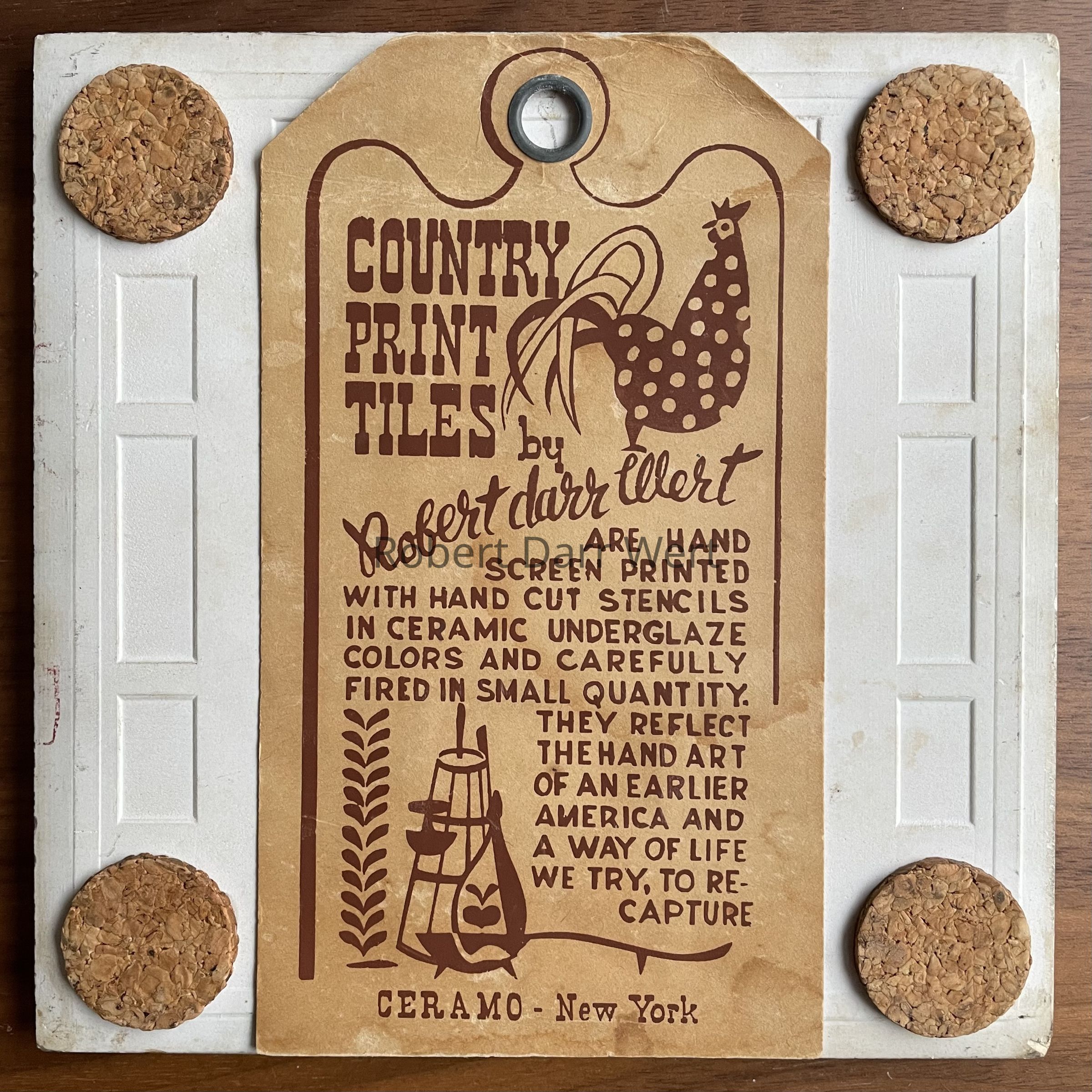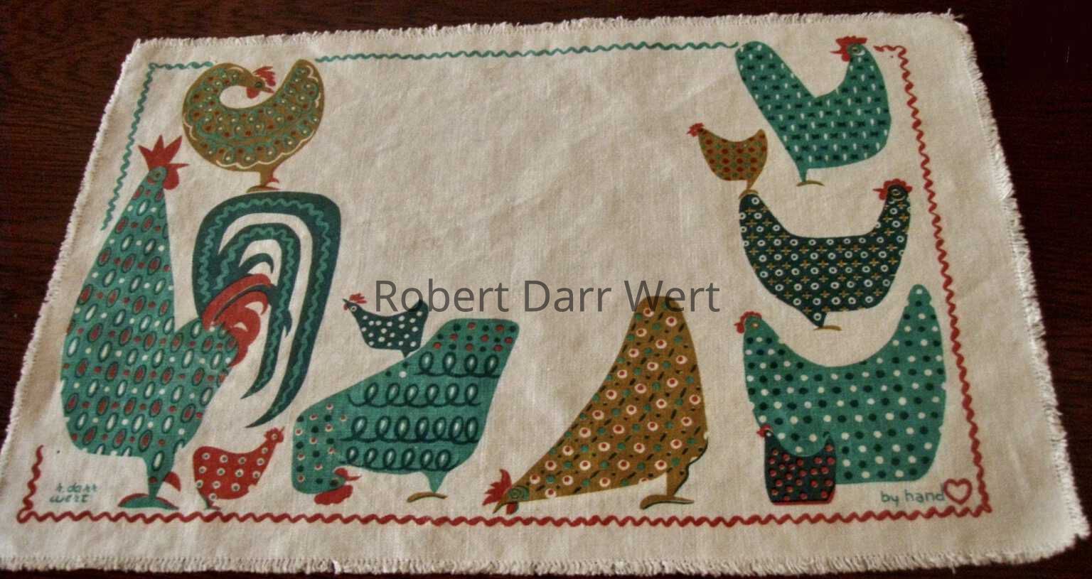 Front: “r. wert”, with heart, lower left corner. Back: Country Print Tiles label hanger.