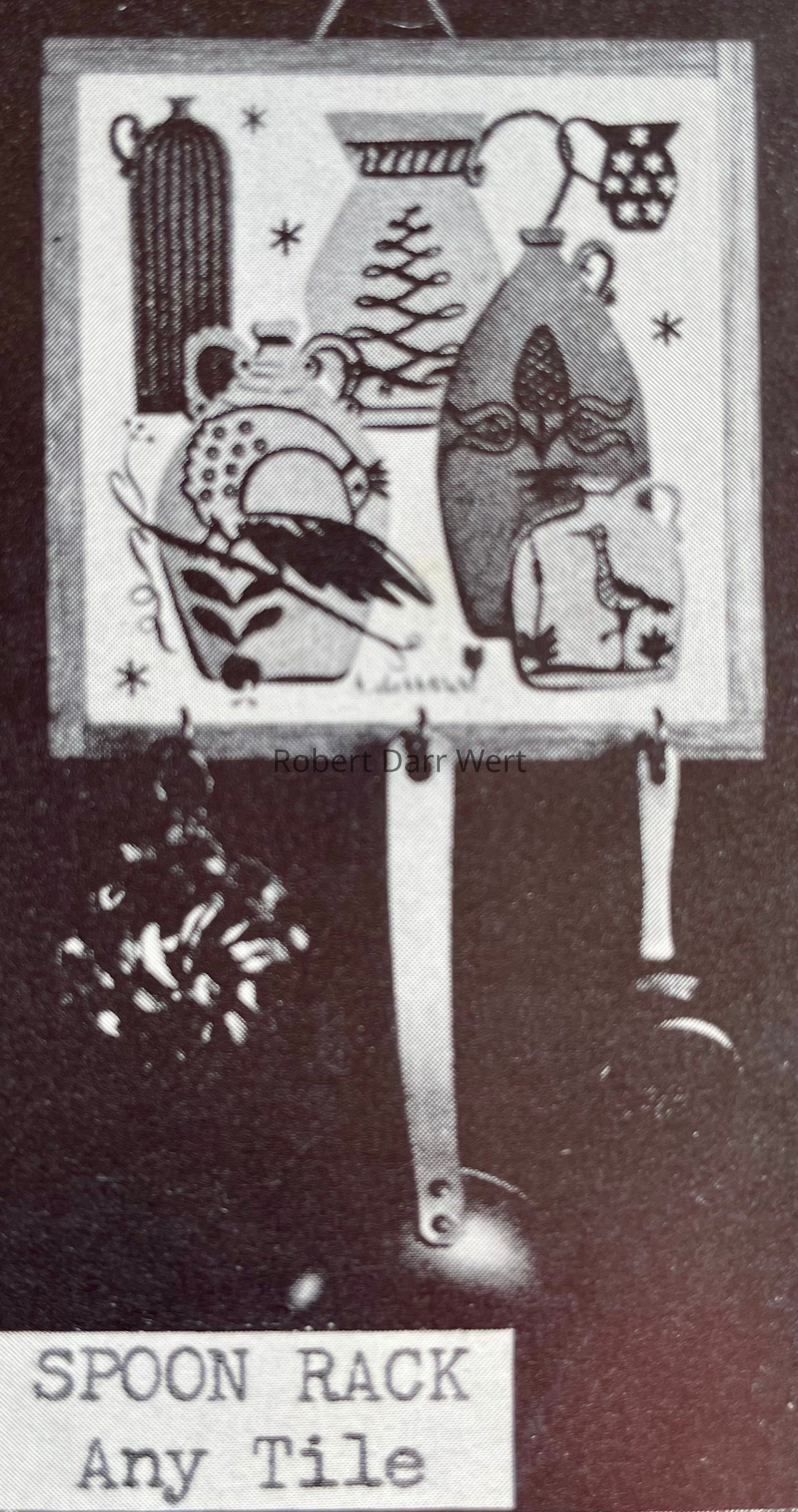 Tile designed by Robert Darr Wert, and produced by Ceramo Studio, NYC. Spoon rack frame produced near Gill, MA. Final assembly and finishing by Country Prints in Gill.