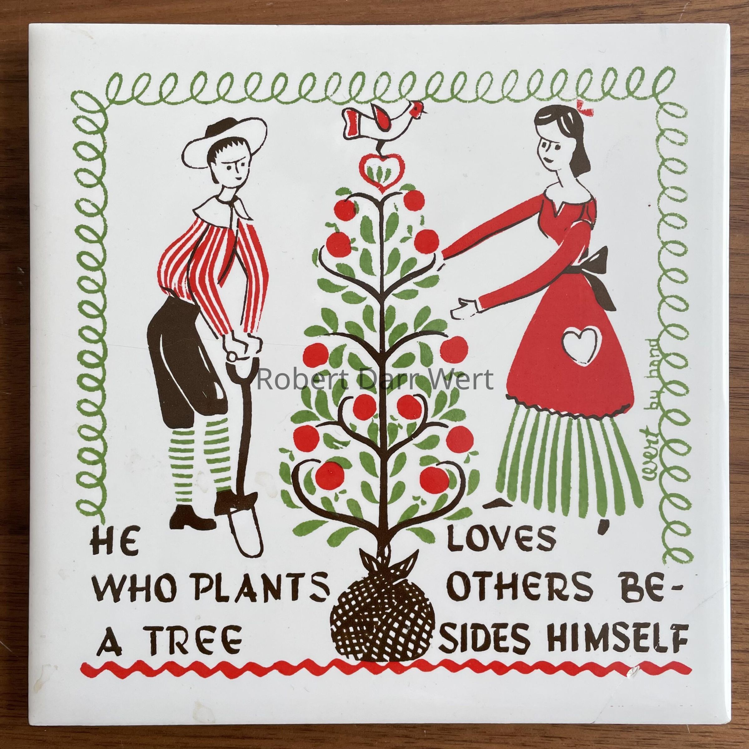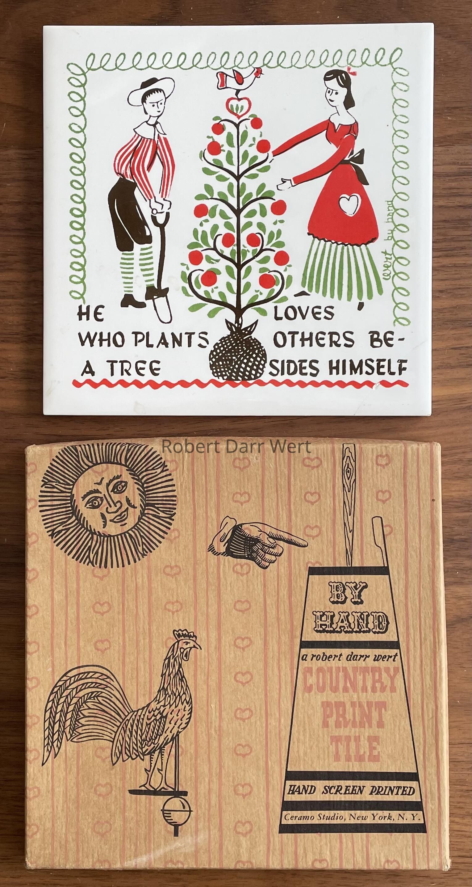 A three-color silkscreen overglaze print on a white glazed tile blank depicting a Pennsylvania “Dutch” couple planting a tree. The woman holds the tree while the man digs. The tree appears to be an apple laden with fruit. Below is a quote from Thomas Fuller, “He who plants a tree loves others besides himself”. In 1732, English minister and physician Thomas Fuller published “Gnomologia: Adagies and Proverbs”, a collection of over 5,000 quotes, including the one found on this tile; see web link.