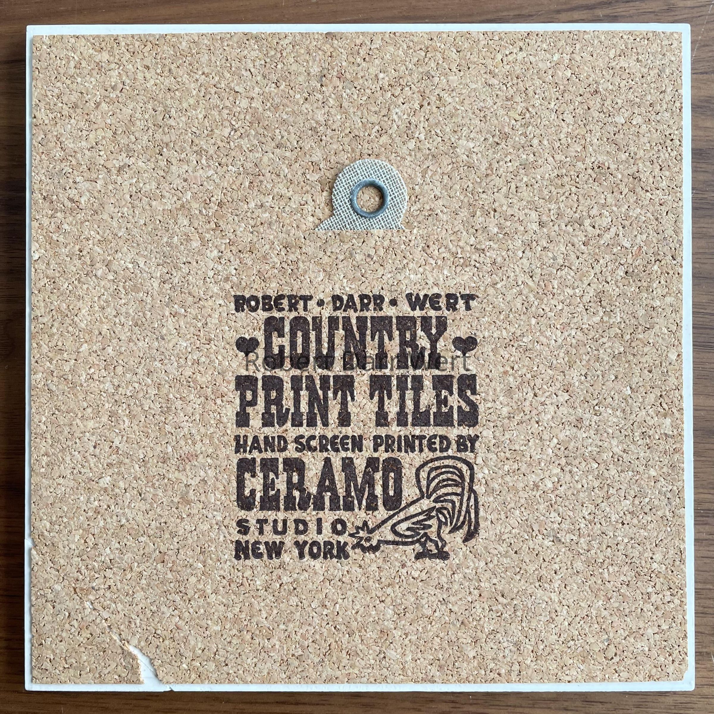 Design, screen production, and mixing of colored overglazes performed at the Country Prints workshop, Gill, MA. Screen printing of overglaze colors, firing and finishing by Ceramo Studio, NYC. This example is printed on the thinner tile body used by Country Prints/Ceramo Studio from 1962 onward.