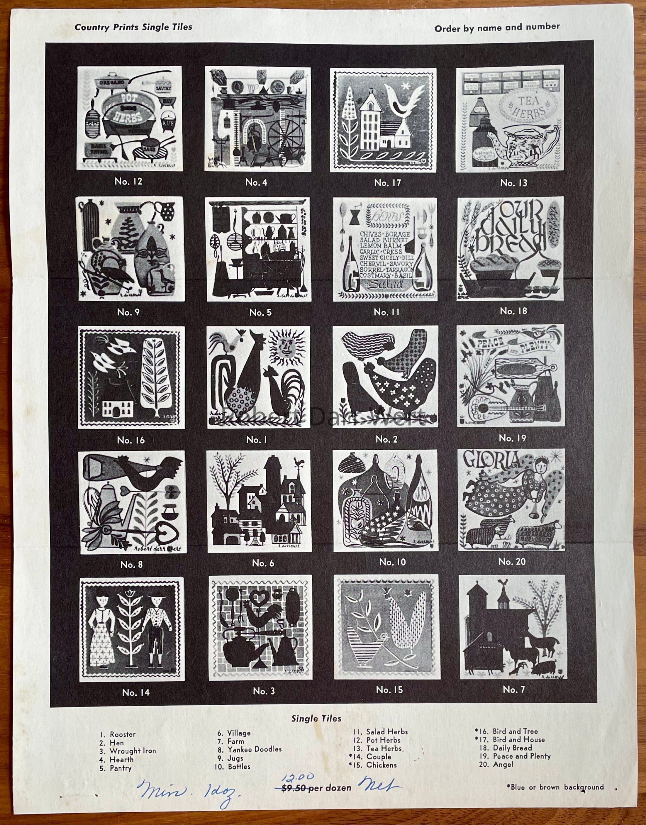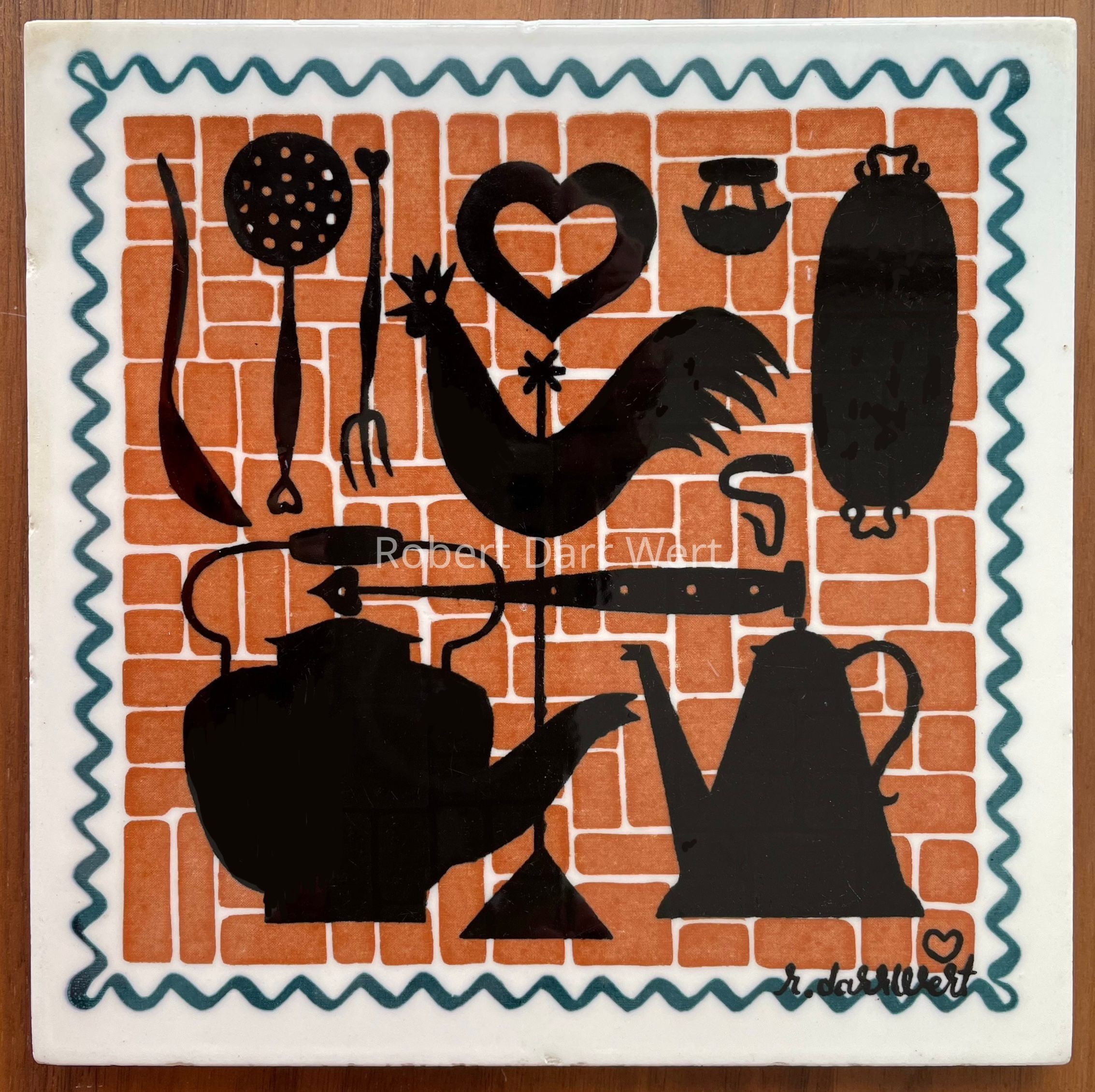 A three-color silkscreen underglaze print on a white tile blank depicting examples of wrought iron in silhouette against a brick patterned ground bordered with a rickrack style wavy line. This tile design appears in the c.1953 brochure “Robert Darr Wert/Country Print Tiles”, the c.1956 brochure “Country Prints Tiles designed by Robert Darr Wert”, and the c.1960 brochure “Robert Darr WErt/Country Print Tiles”. It was also included in a 1955 cover article about Robert Darr Wert and Country Prints in the art journal Design; see images. This design continued in production from c.1954 through the 1960’s.