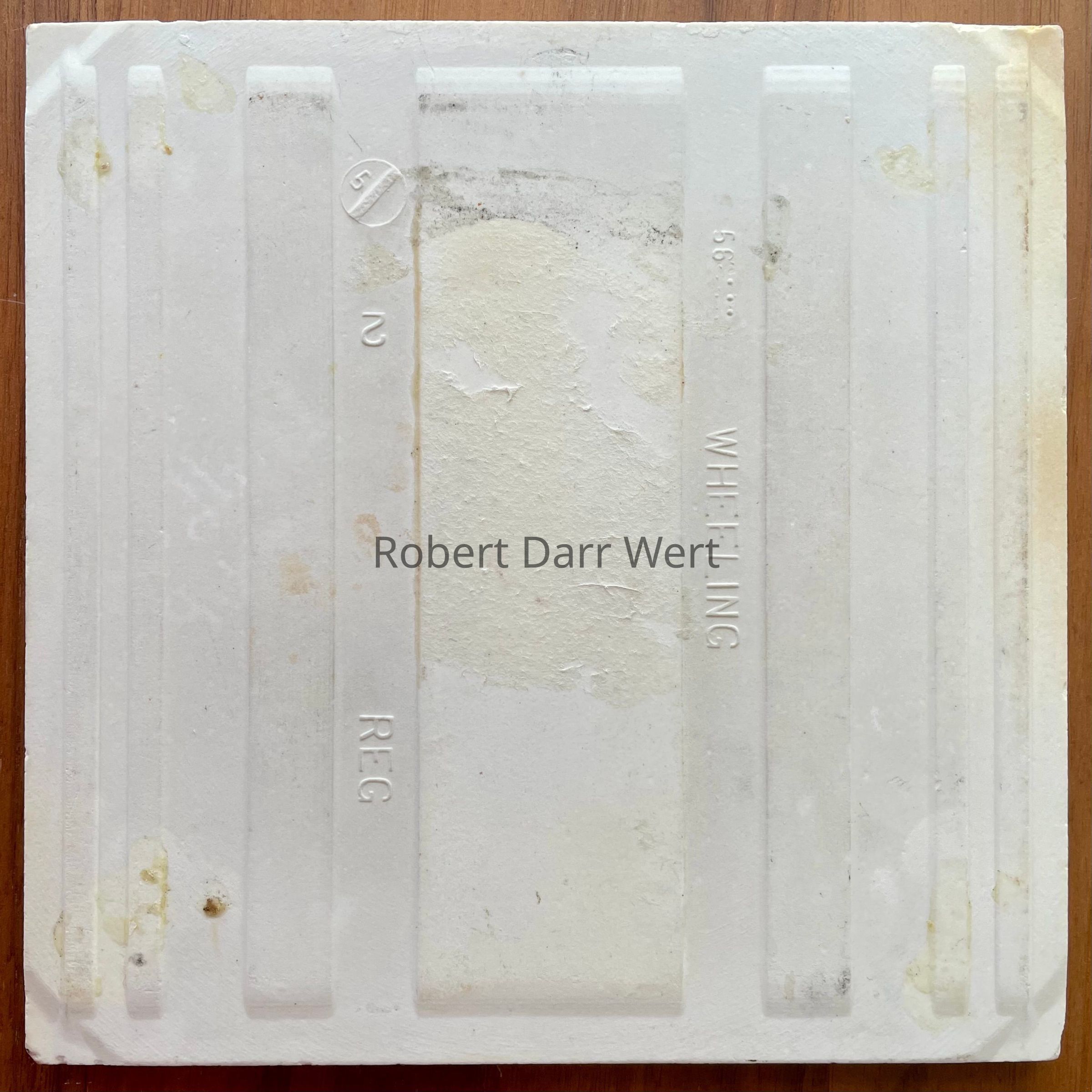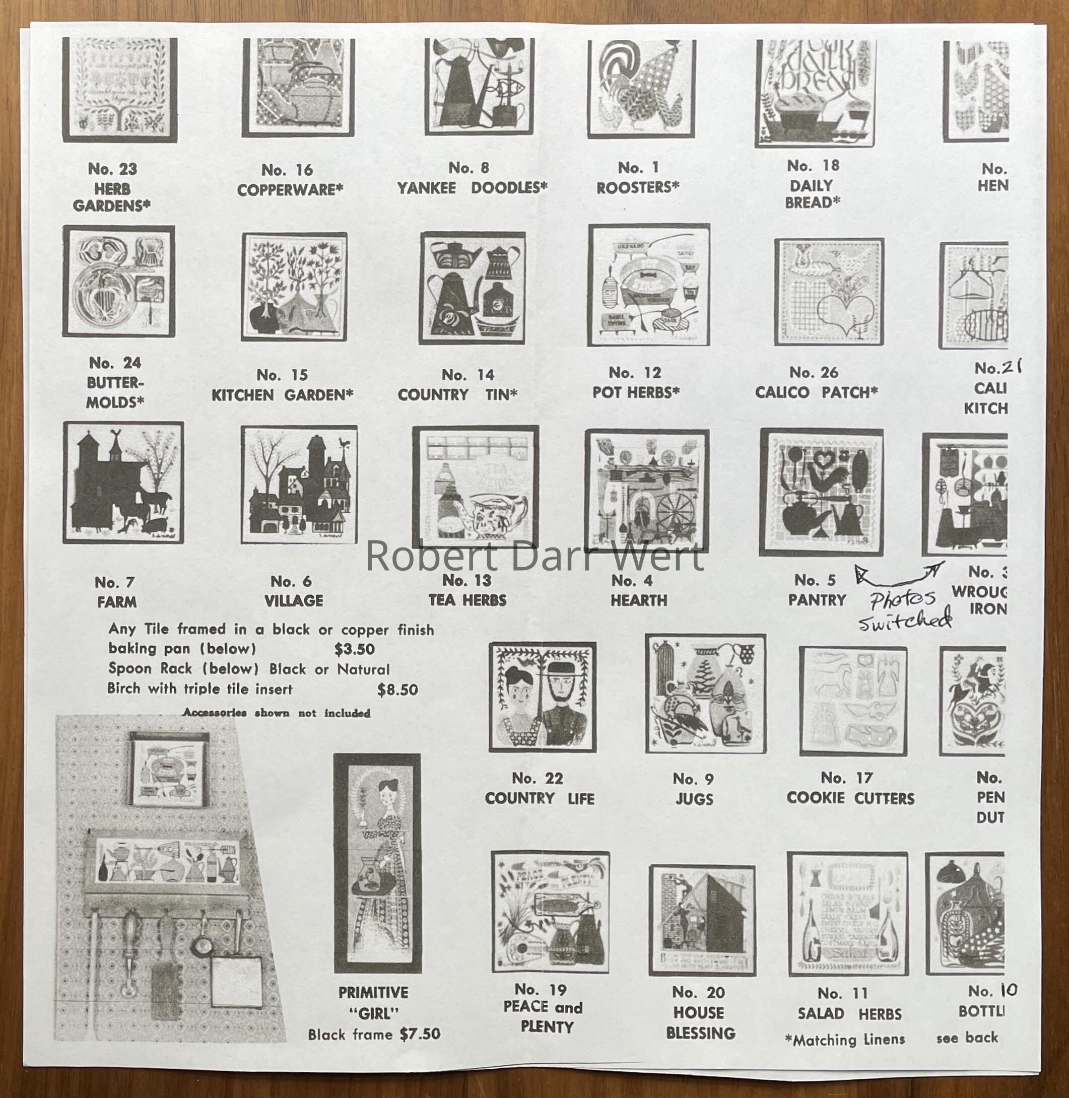 Front: “r. darr wert” with heart, lower right corner. Back: Country Print Tiles label hanger.