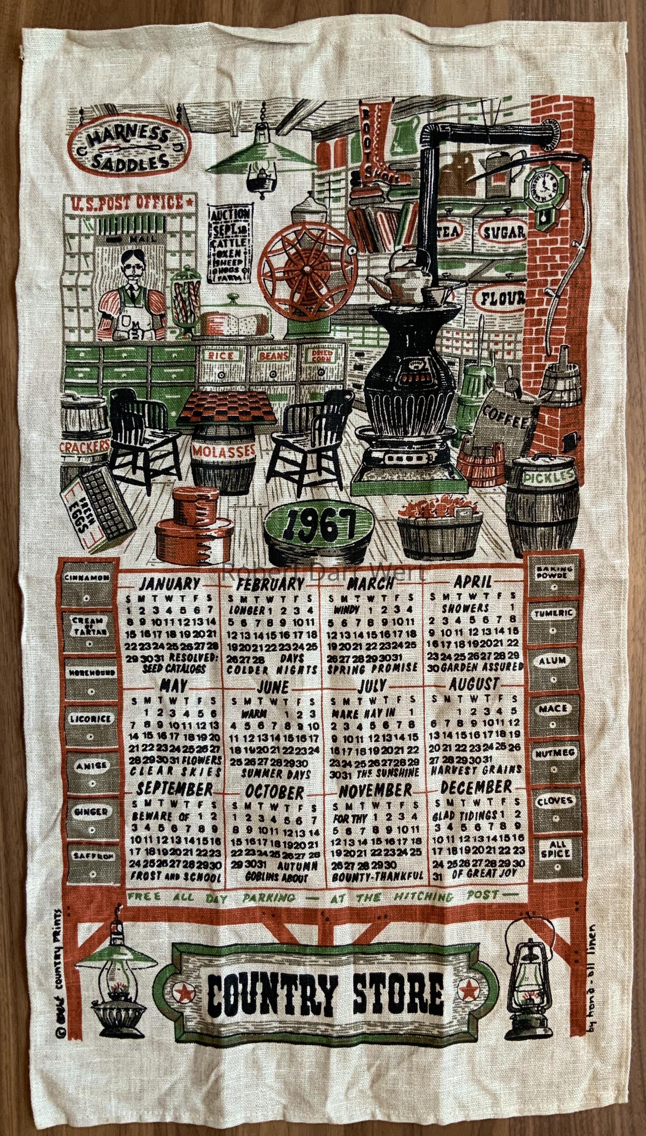 A four-color silkscreen print on natural linen depicting the interior of a country store, with the calendar months flanked by spice drawers.