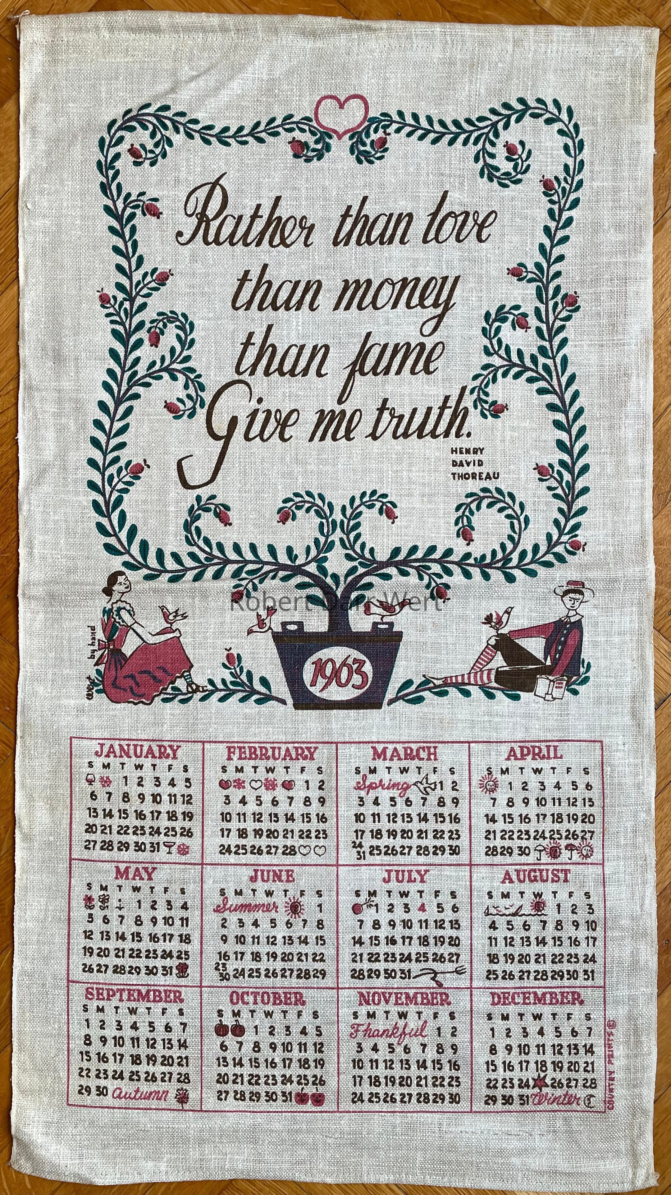 A calendar towel with a three-screen/four-color silkscreen print on white linen. Above the printed calendar, an eighteenth century couple sits on either side of a large wooden bucket emblazoned with the year 1963. From the bucket grows an espaliered fruit tree with branches framing a quote from Henry David Thoreau:
