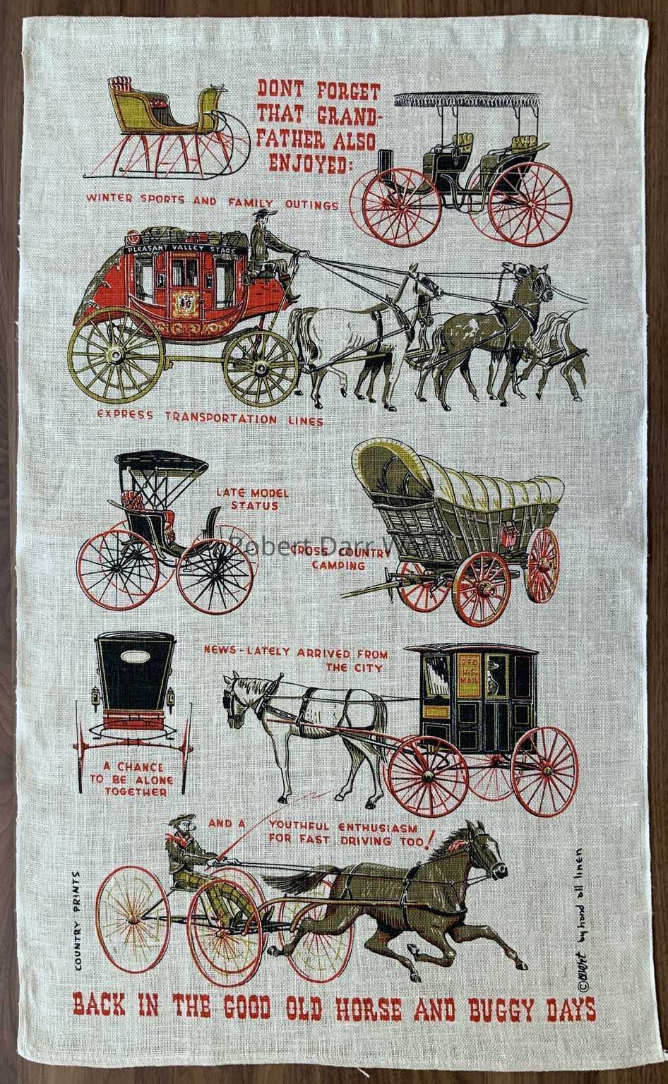 A four-color silkscreen print on natural linen depicting vehicles, tools and implements of the horse and carriage days framing a 1967 calendar.