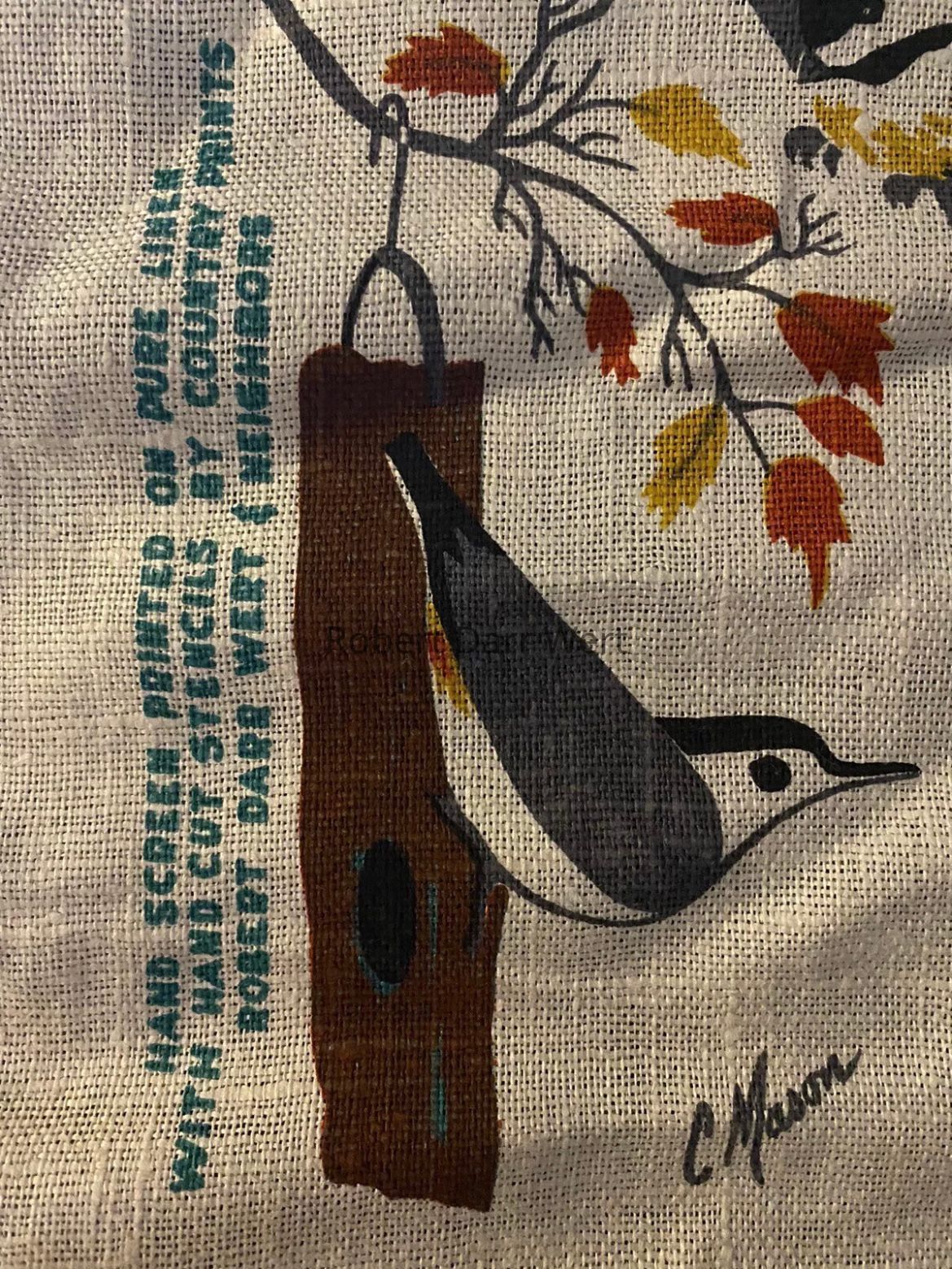A 1965 Calendar towel printed by Country Prints for the Massachusetts Audubon Society (MAS). The print is signed by artist C. Mason. This is one of two calendar towel designs produced for the MAS in 1965.