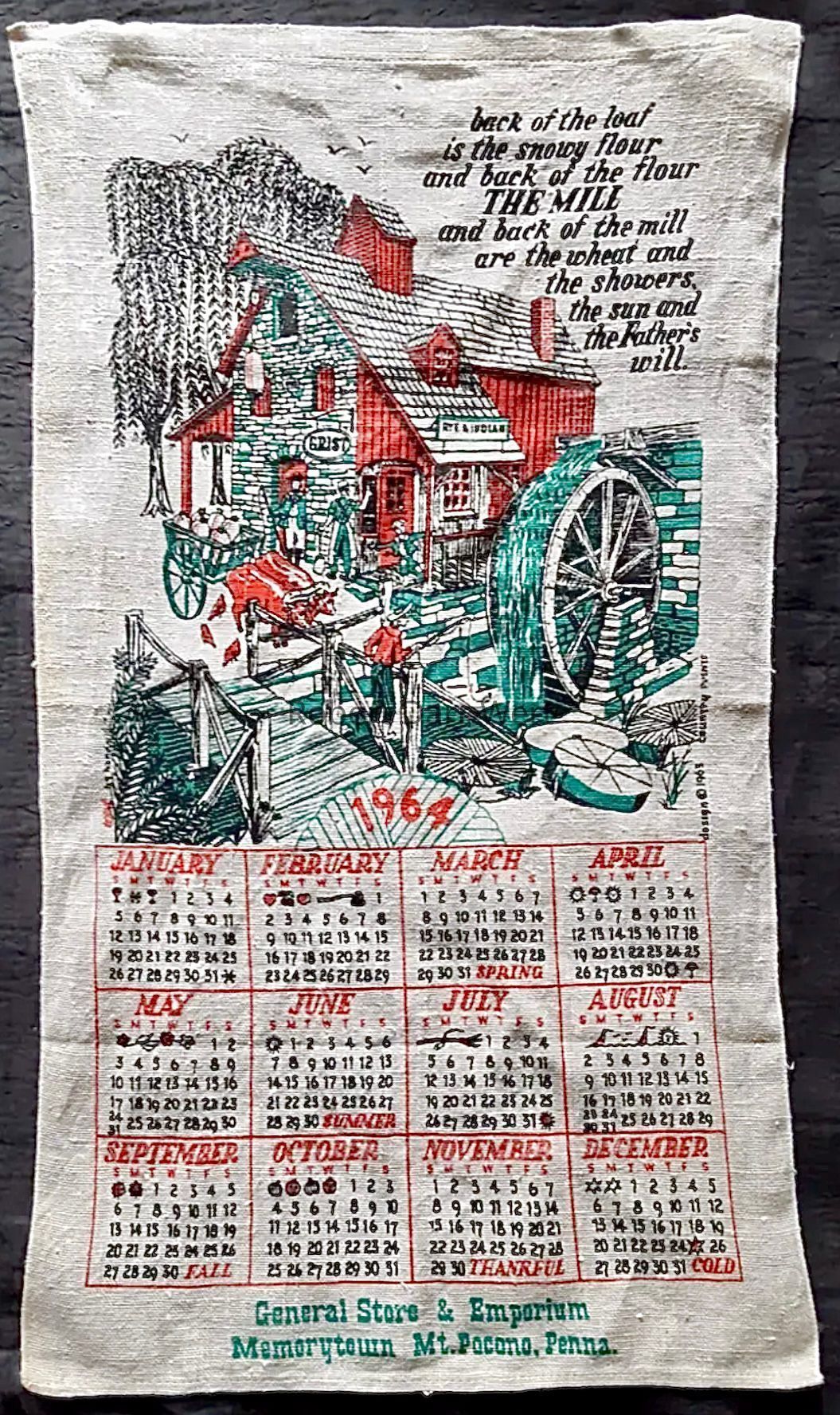 This calendar towel has a custom imprint for the General Store and Emporium at Memorytown, Mt. Pocono, Pennsylvania, now an inn and events venue with no retail operations; see web link.