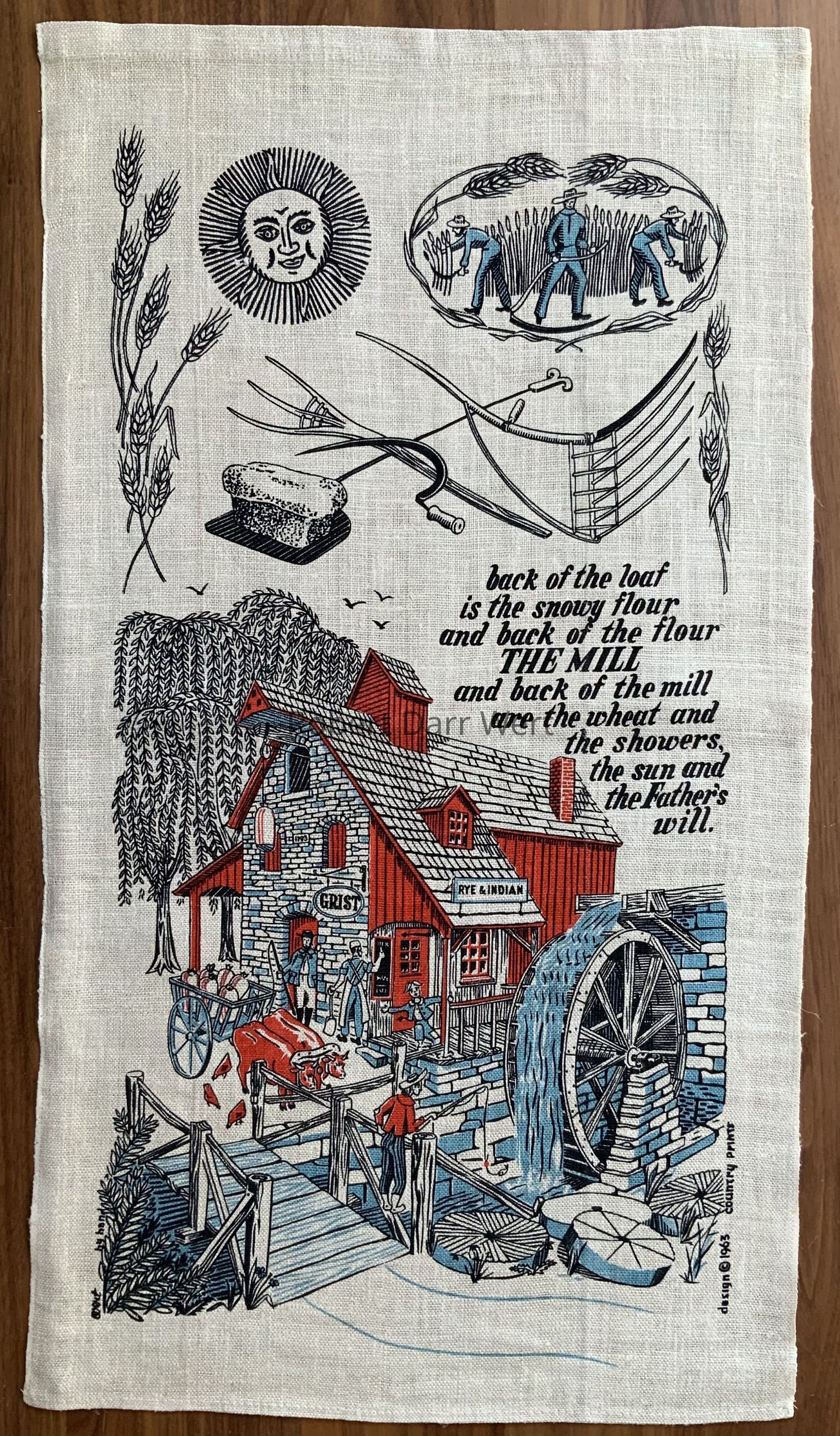 A calendar wallhanging with a three-color silkscreen print on natural linen depicting a busy stone-ender gristmill.