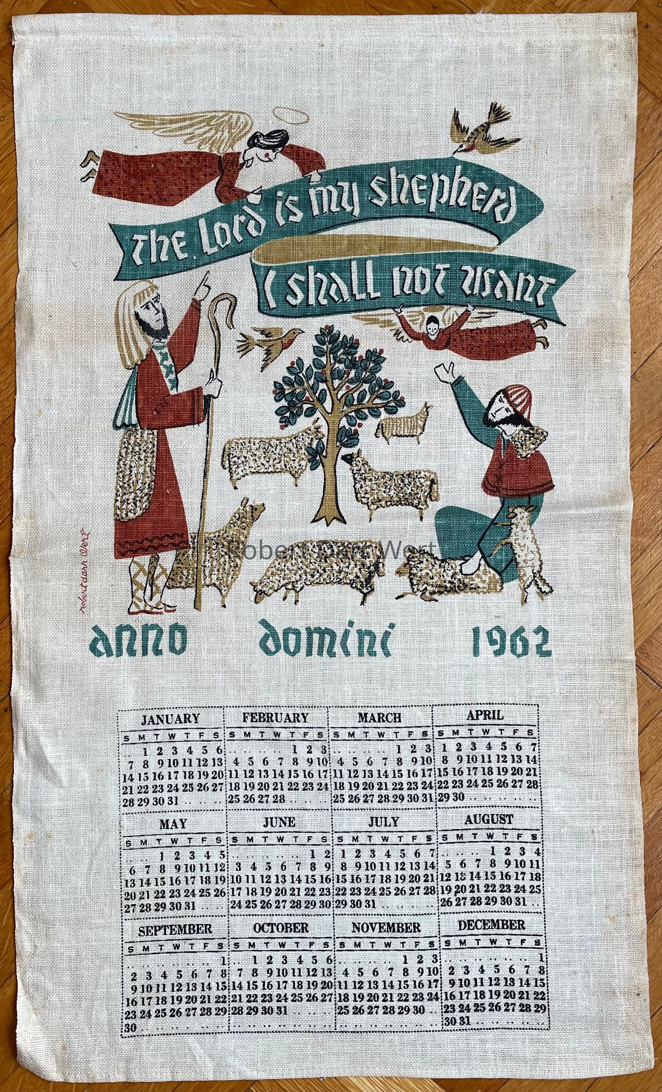 A four-color silkscreen print on natural linen depicting two shepherds tending a flock of sheep while two angels and a bird hold aloft a banner emblazoned with the first line of Psalm 23 from the King James Bible, “The Lord is my shepherd, I shall not want.” Below the shepherds and flock is the text, “anno domini 1962.” This calendar has also been documented with a 1963 calendar.