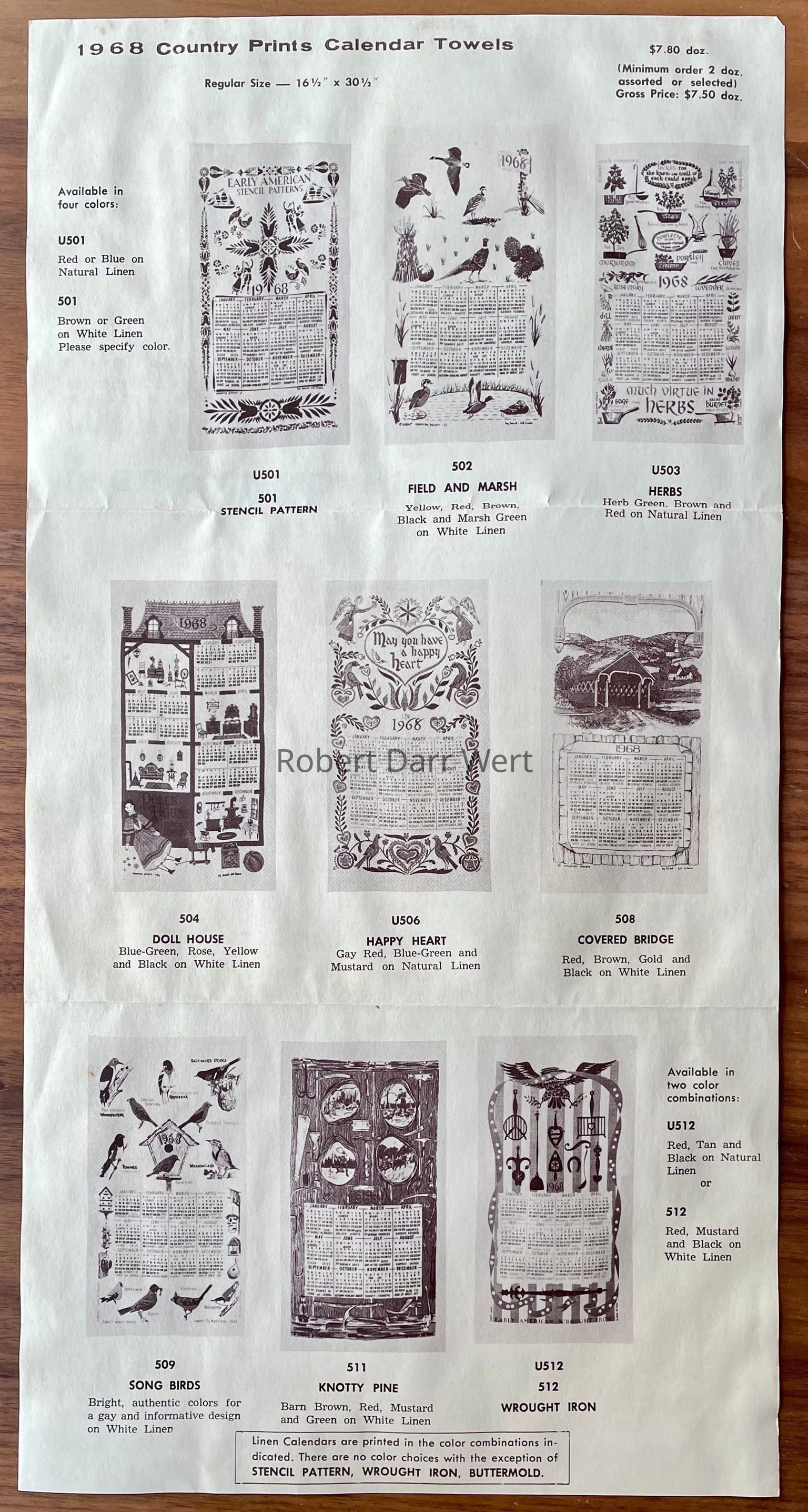 A calendar towel featuring designs inspired by early American stencil patterns. The artwork was developed by an unidentified freelance artist hired by Country Prints after Wert’s death in January 1966. It is signed with the initial F.