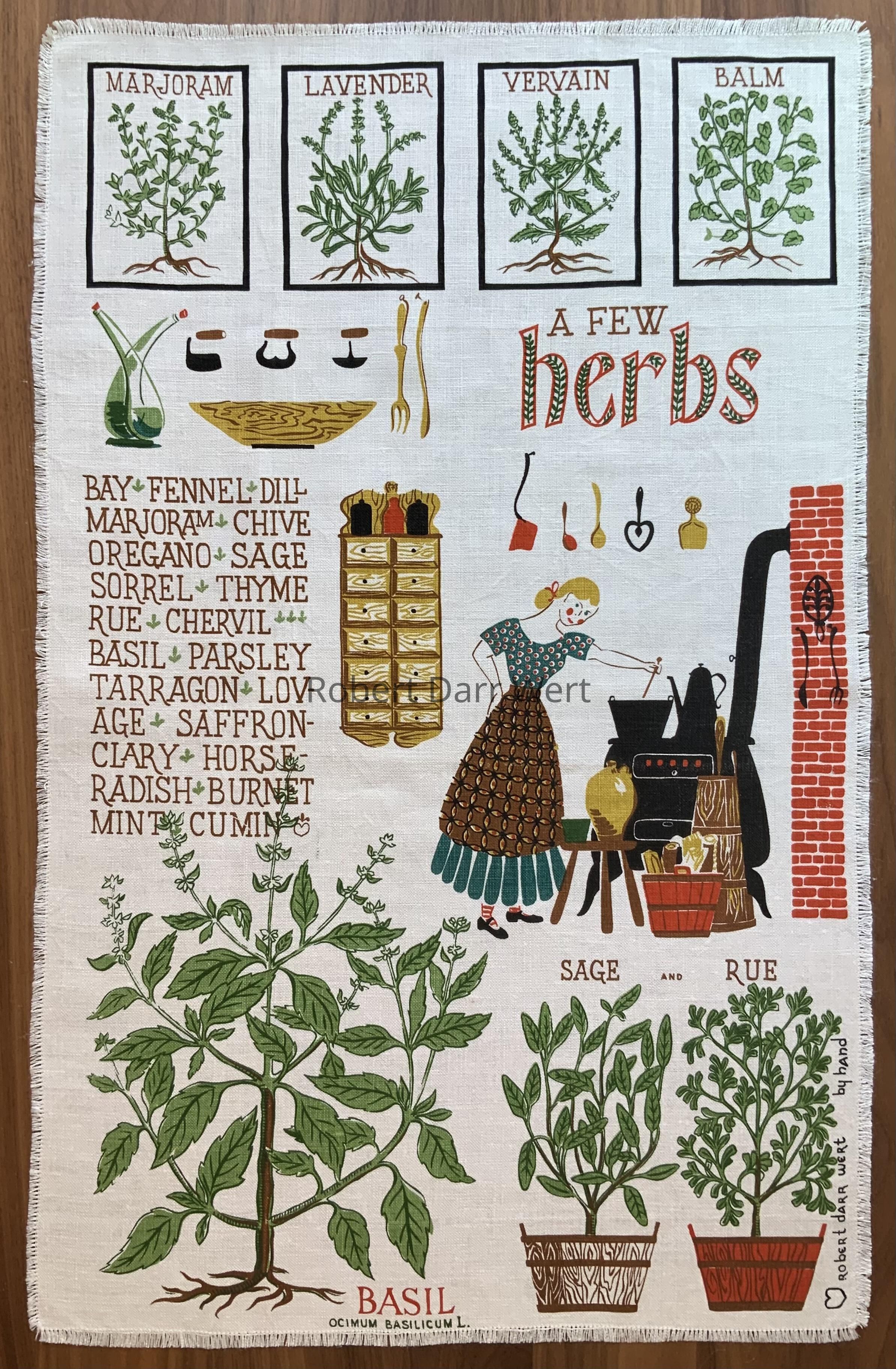 A six-color silkscreen print on off-white linen depicting herb plants, herb names, a woman at a cook stove, a wall mounted spice cabinet, and kitchen tools including a wooden salad bowl and salad servers.