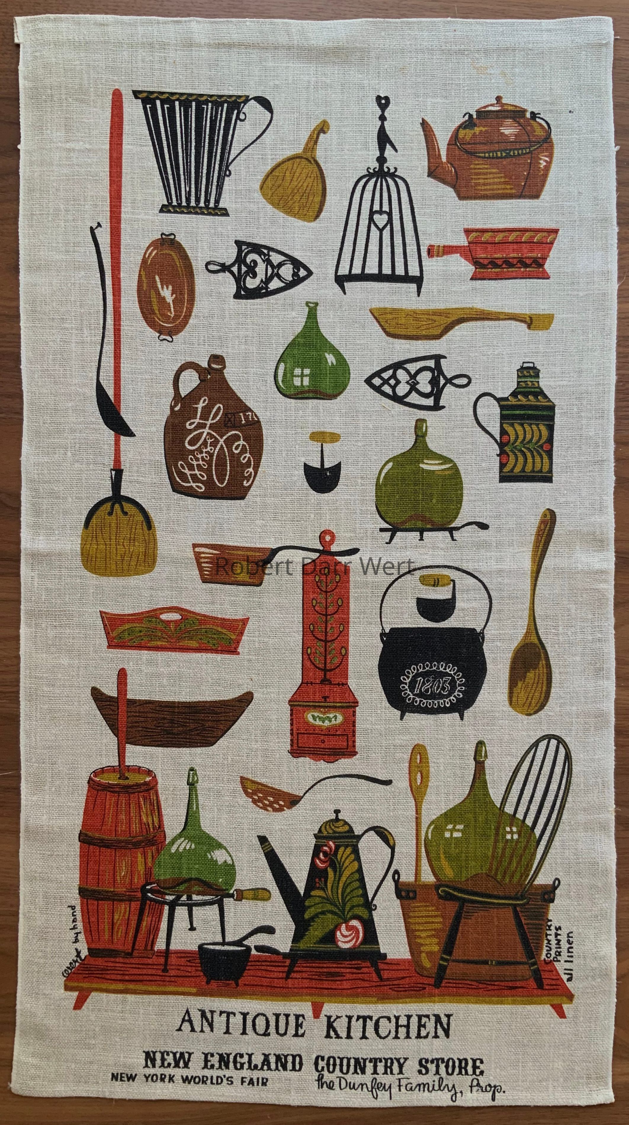 “wert” in script and “by hand” in block print, lower left corner; “COUNTRY PRINTS all linen” in block print, lower right corner; “NEW ENGLAND COUNTRY STORE, NEW YORK WORLD’S FAIR, The Dunfee Family, Prop.”, lower margin.Dimensions