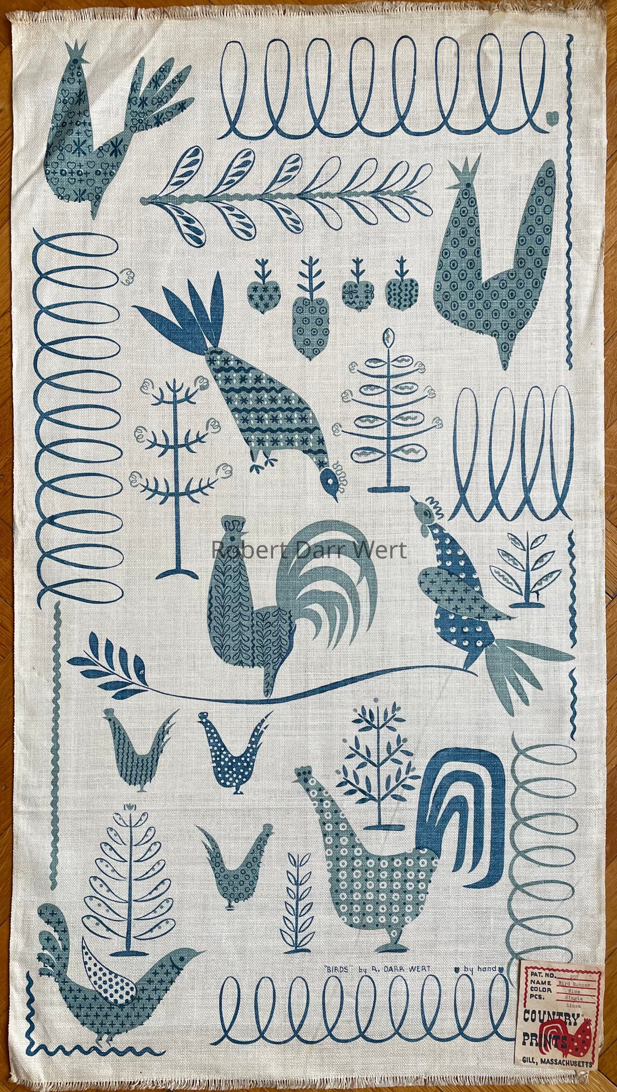 A c.1955 Country Prints price list describes this print, “Calico Country Print Birds for yesterday’s kitchens and today’s. Red, Blue or Brown.”