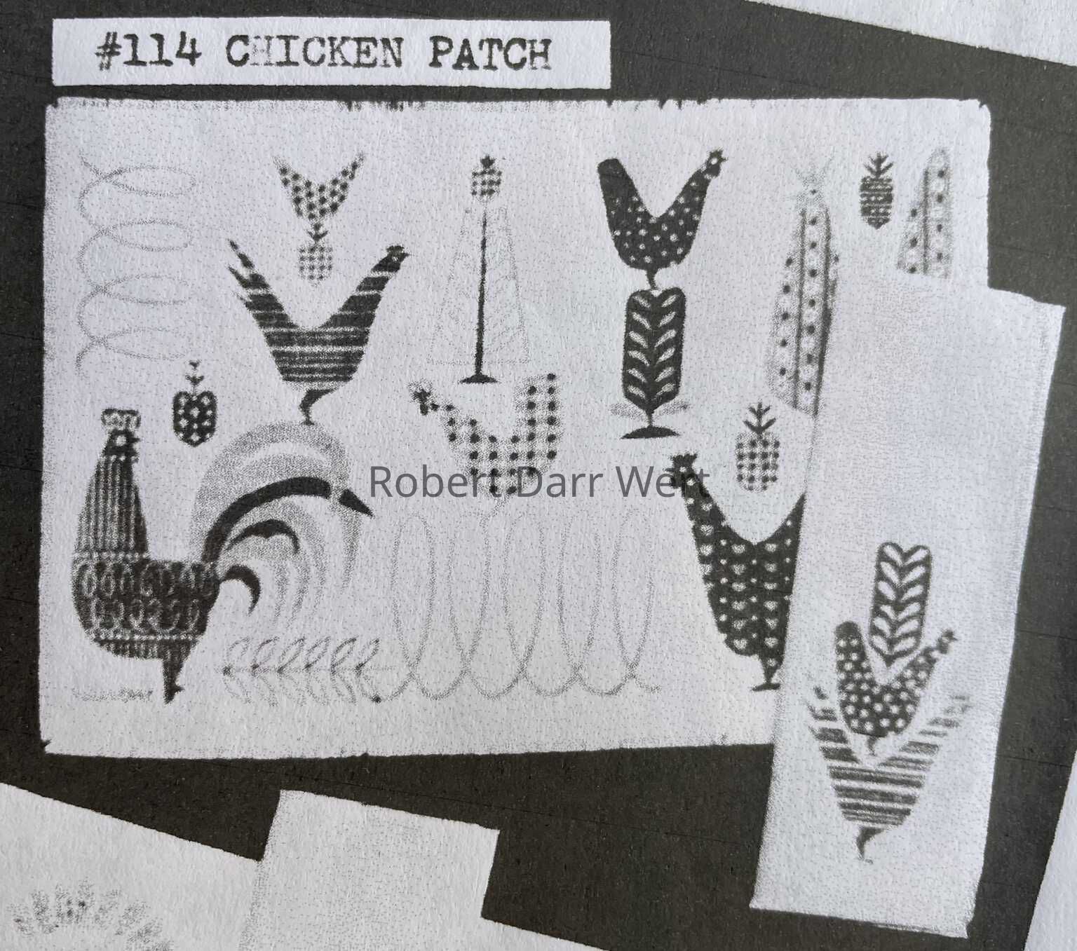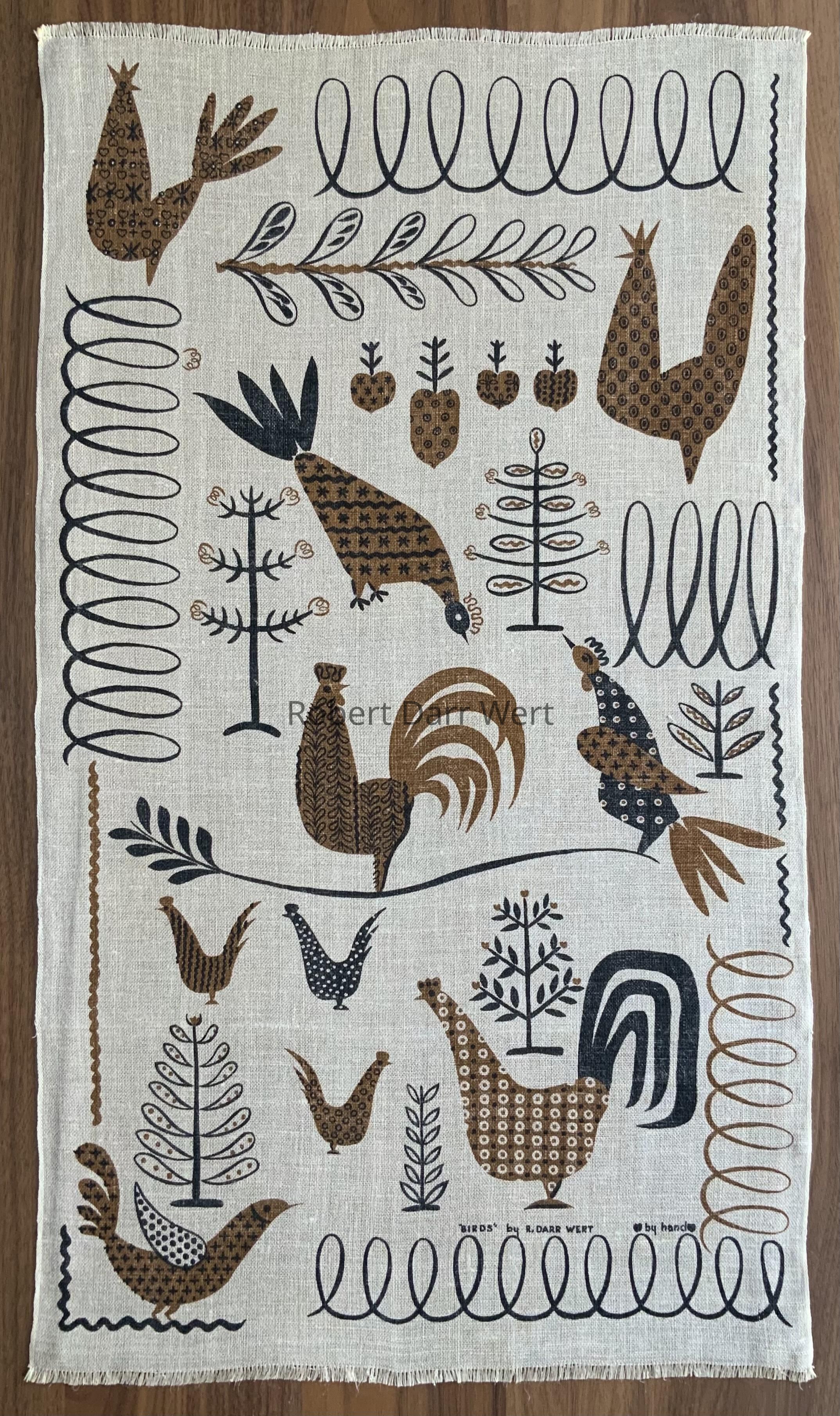 A two-color silkscreen print on natural linen depicting hens, roosters and birds amidst calligraphy-like plants, fruit, scrolls and rickracks. Each bird is superimposed with Wert’s interpretation of calico prints, and stand at varying degrees of attention, each focusing somewhere within the field of the wallhanging. It was produced in three colorways; see separate entries.