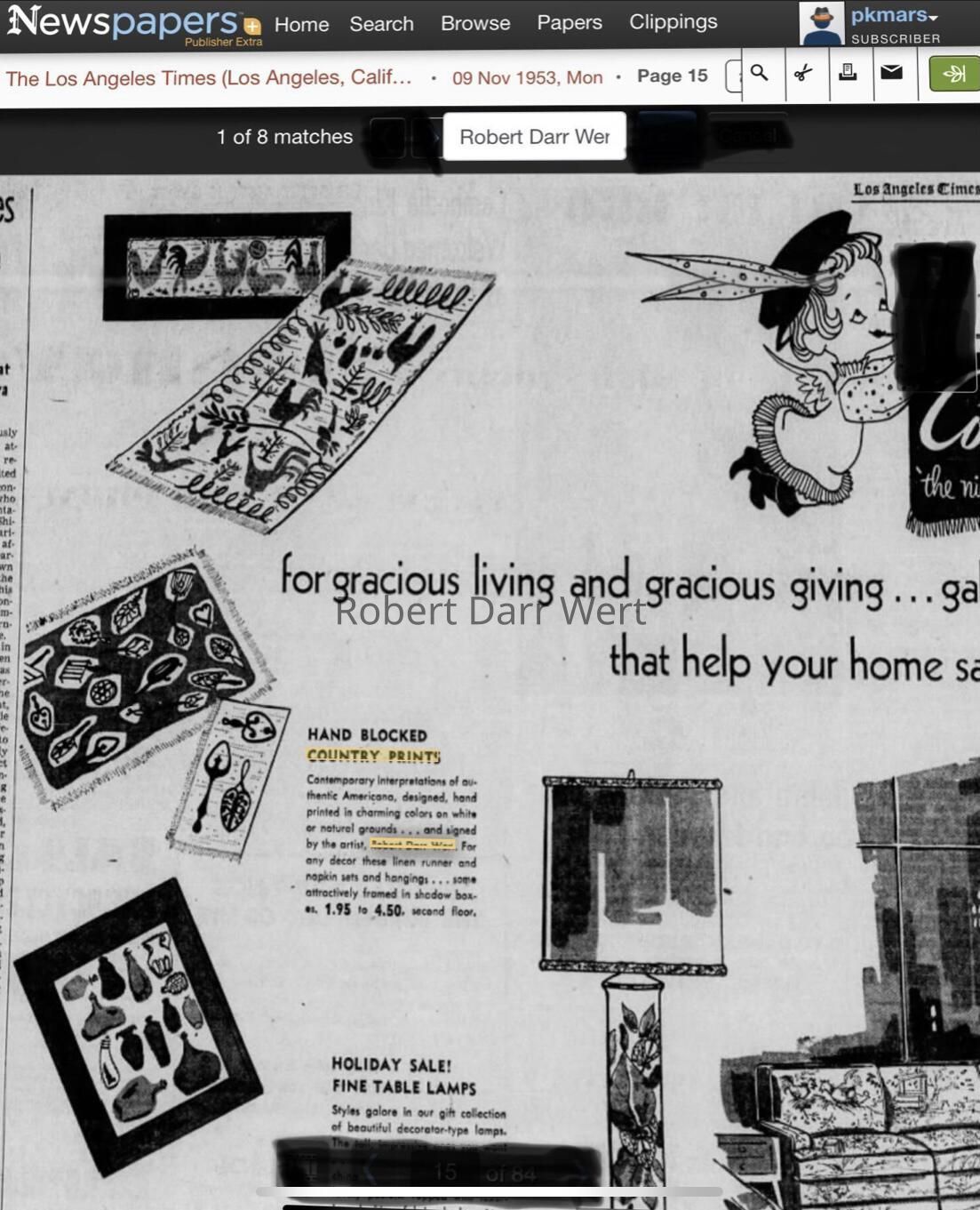 This print was marketed for use as a kitchen towel, wallhanging, or table runner, and is listed on a c.1951 Country Prints packing slip, and appears in a c.1952 brochure for Churchill Barn, owned by Stanley G. Churchill, Country Prints’ lead sales representative throughout the 1950’s. It is also illustrated in a 1953 ad for Coulter’s Department Store of Los Angeles, and is shown being printed in a 1959 article about Country Prints in the Springfield Republican of Springfield, Massachusetts; see images.