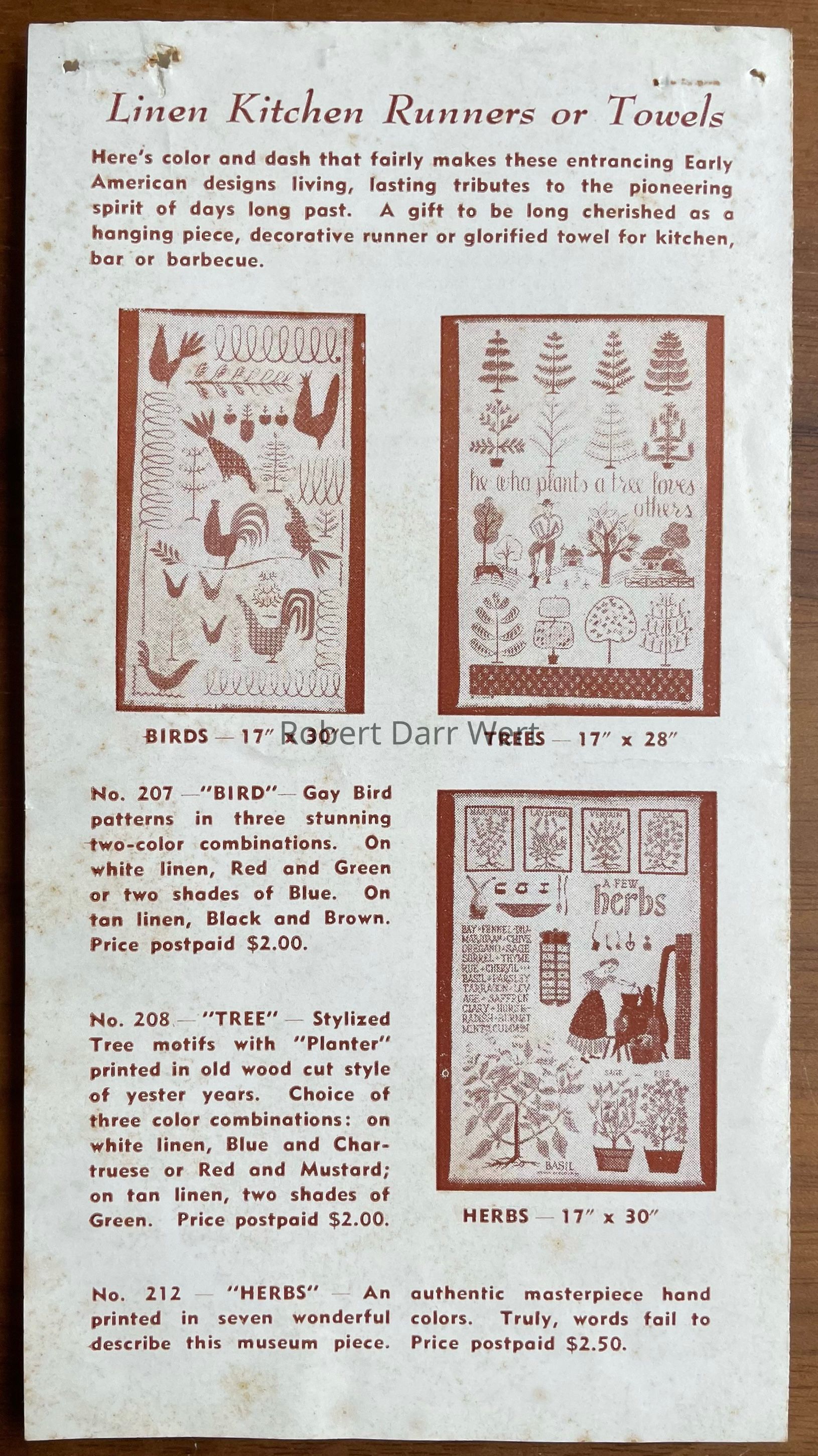 The price list also states, “Pure Linen Kitchen Runners and Towels, Nice enough to “Hang” or Frame — in fact we now offer any of these framed in a flat early black frame at $10.00.”
