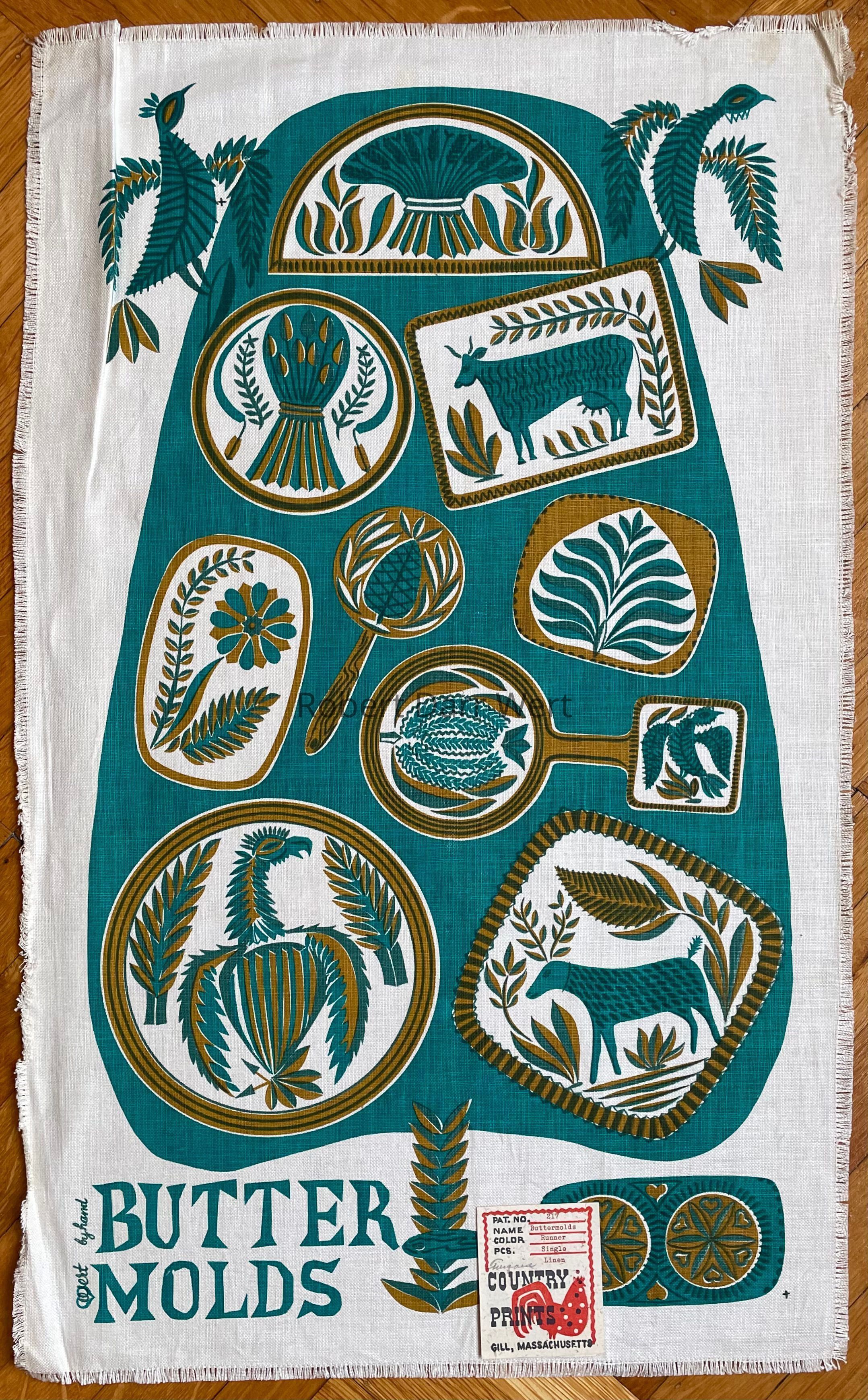 A three-color silkscreen print on off-white linen depicting ten carved wood butter mold designs arrayed on and off of an oversized butter paddle. Butter mold subjects symbolize health, wealth and plenty.