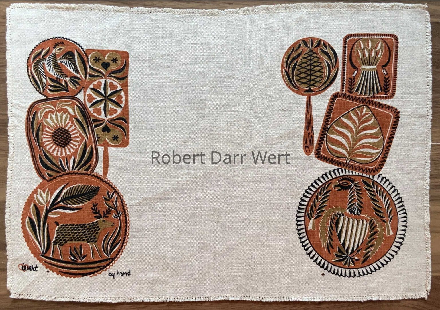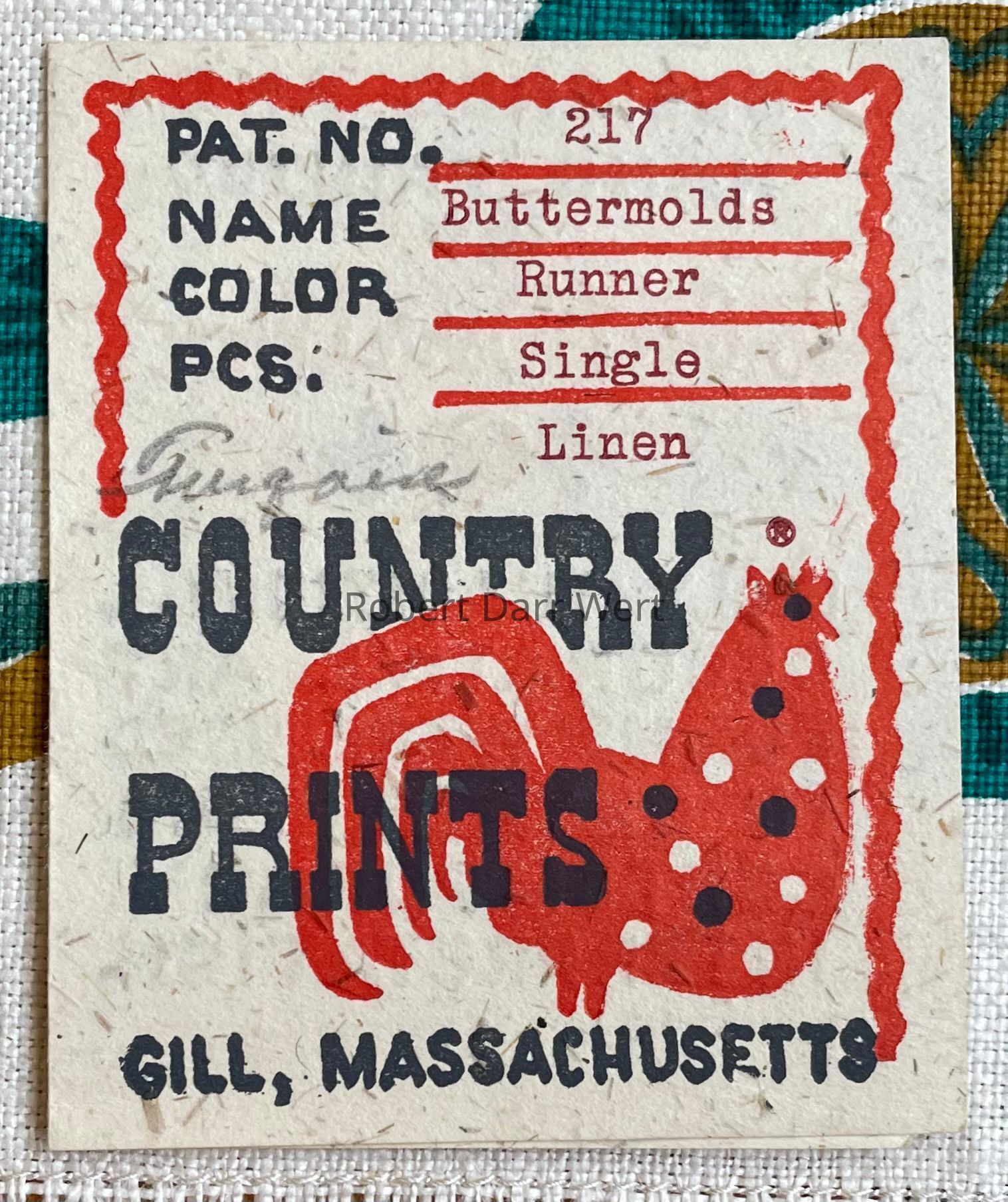 This print was marketed for use as a kitchen towel, wallhanging, or table runner, and appears in the c.1954 brochure “Robert Darr Wert/Country Prints Kitchen Hangings”. It was produced in two colorways: early red with antique maple and black, or turquoise, both on white linen.