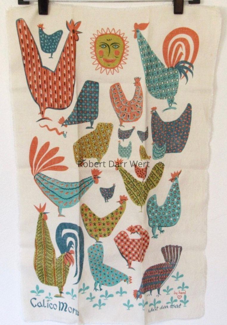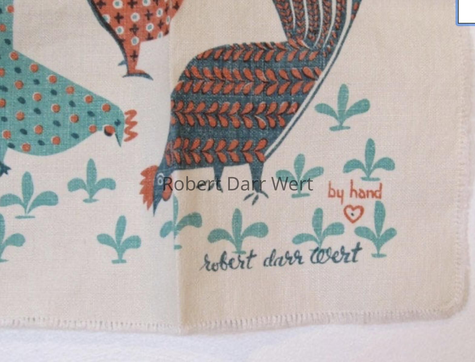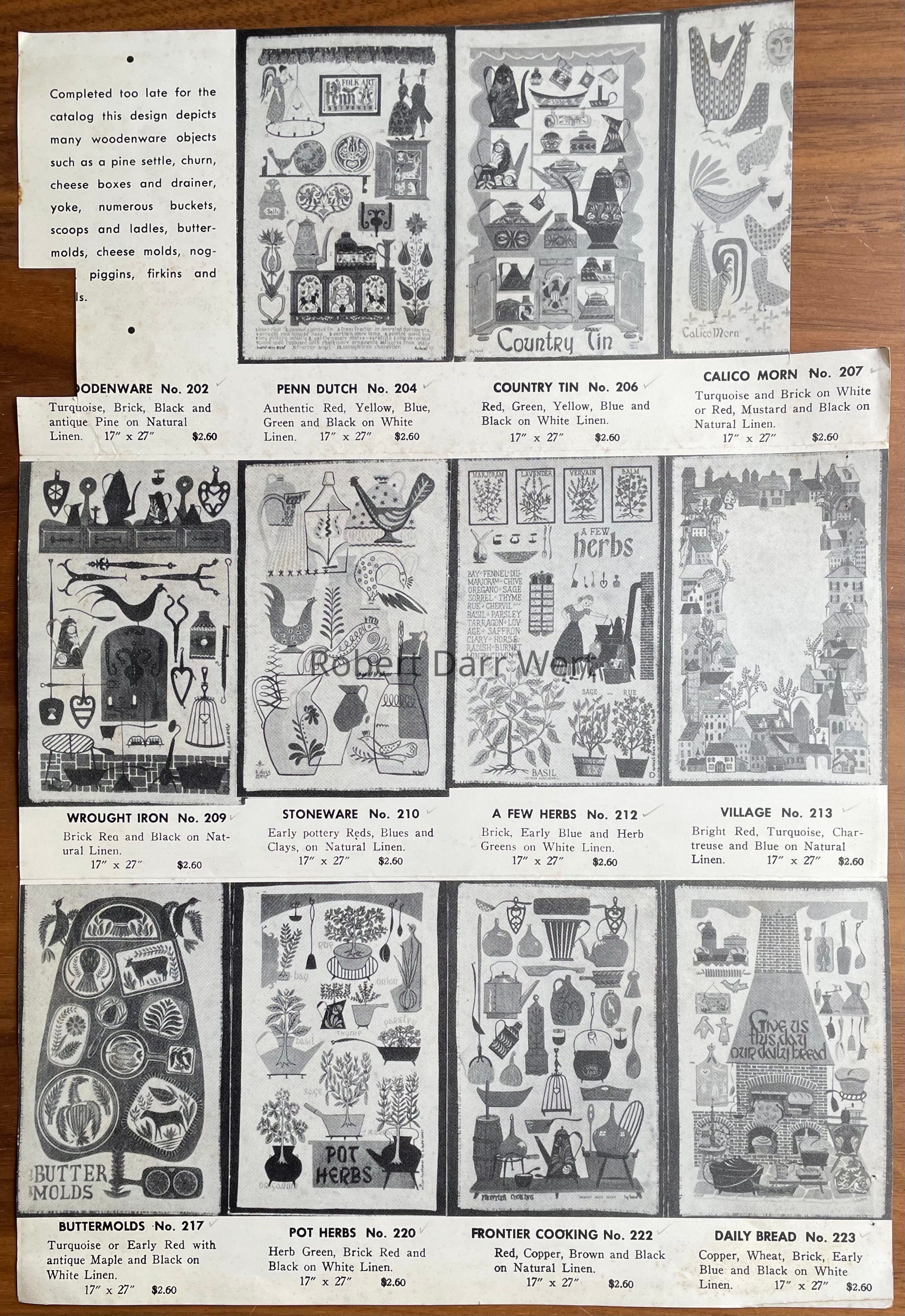 This print appears in the c.1953 brochure “Robert Darr Wert/Country Prints Kitchen Hangings”; see images. It was produced in two colorways, turquoise and brick red on white linen (this example), and mustard and black on natural linen (see separate entry). It is also listed on the c.1955 Country Prints price list which states, “Pure Linen Kitchen Runners and Towels, Nice enough to “Hang” or Frame — in fact we now offer any of these framed in a flat early black frame at $10.00.”