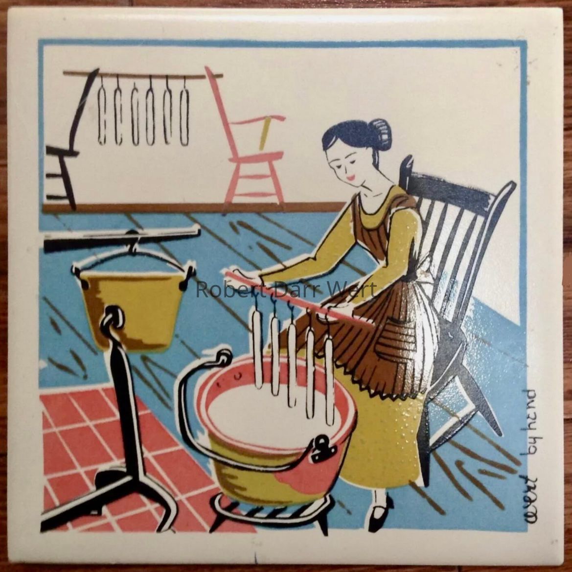 A four-screen/five color silkscreen print on natural linen depicting the tools and materials for making candles and the means of storing and using them.