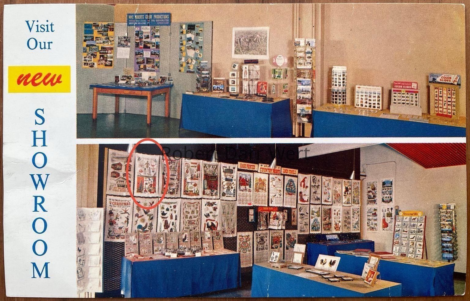 This towel/wallhanging appears on a c.1965 promotional postcard for Bromley & Co. of Boston, Massachusetts, Country Prints’ New England wholesale representative to the gift trade.Made/Created