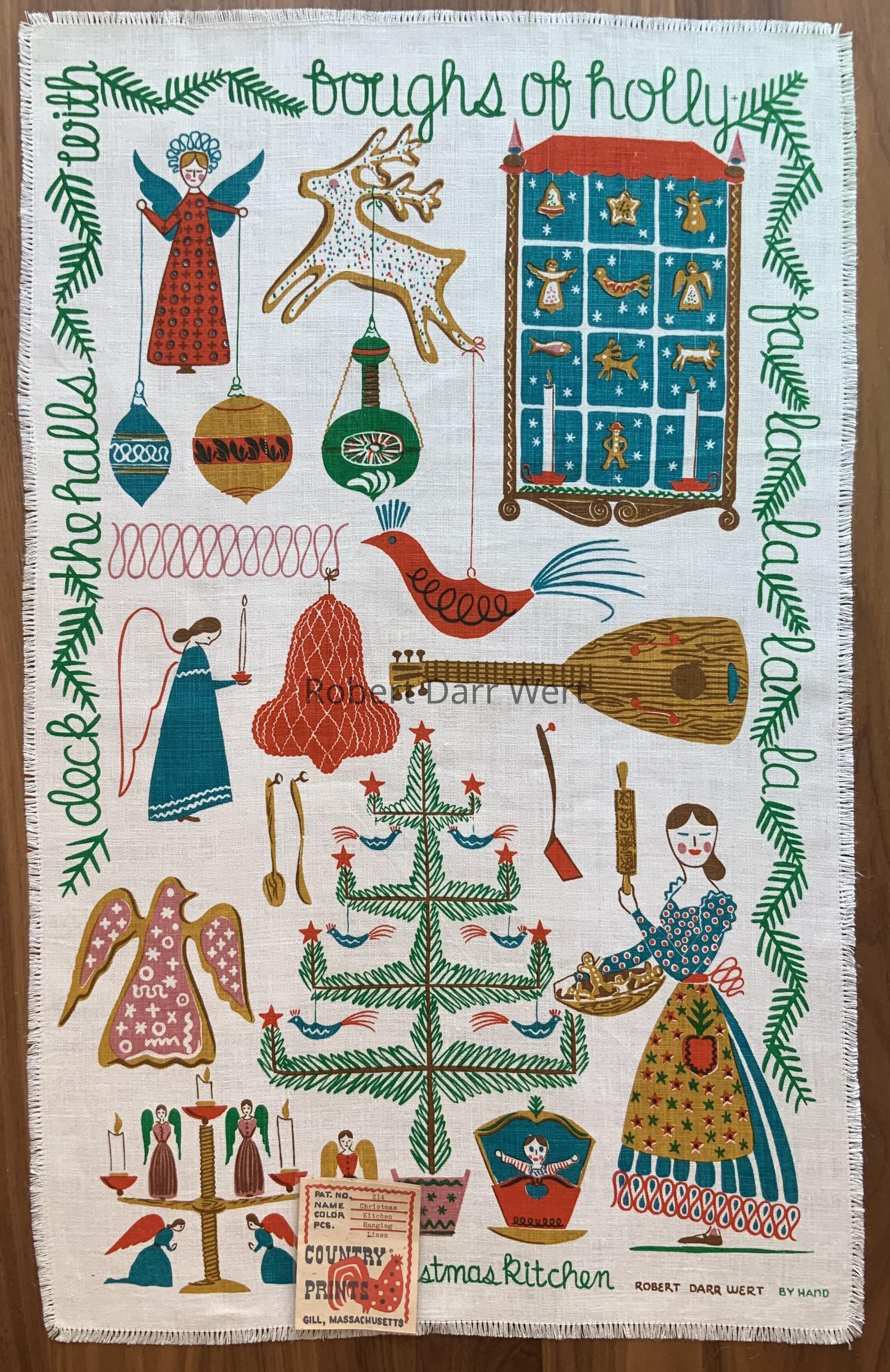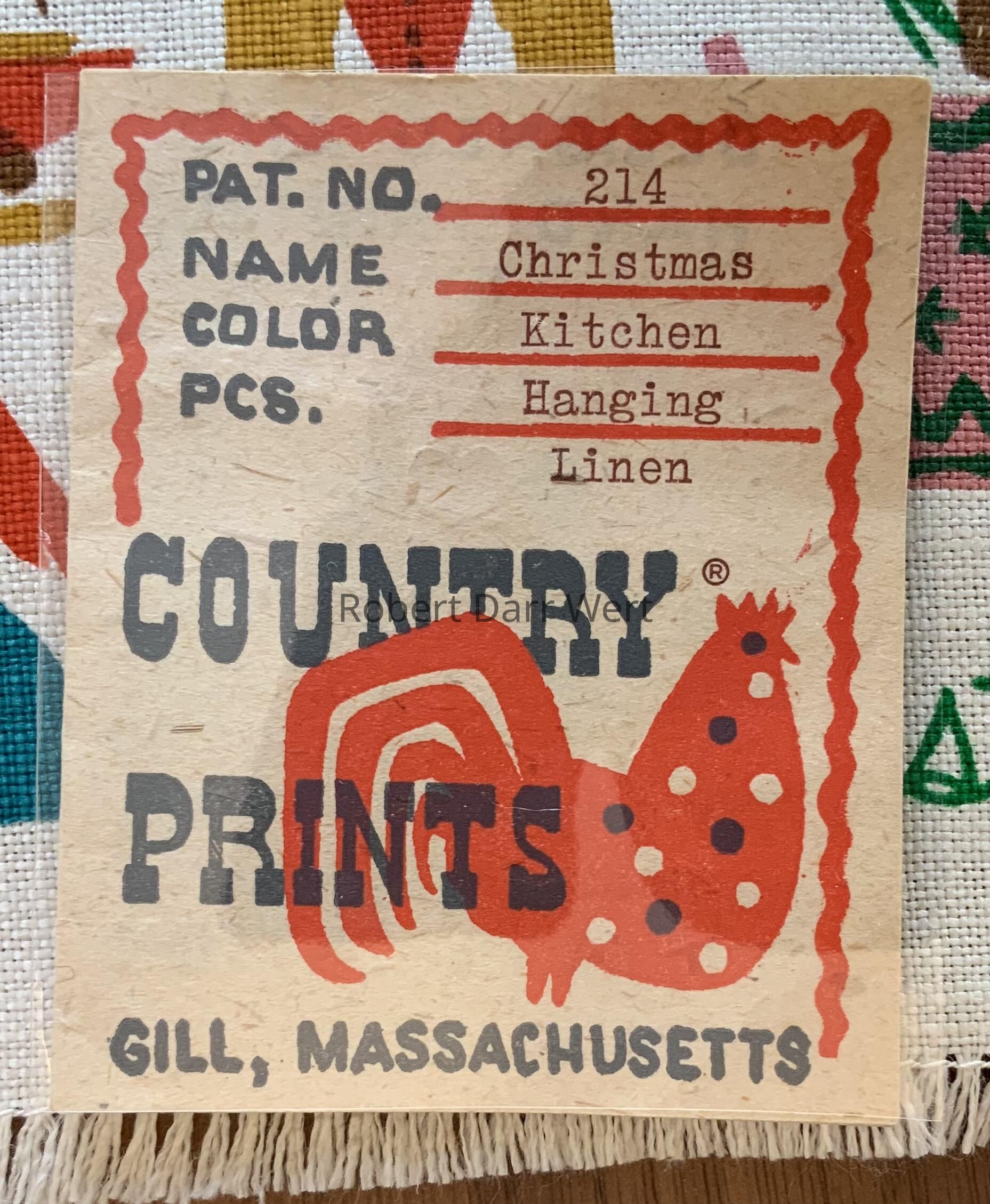 It is also described in a c.1955 price list, “214 Christmas Kitchen — All the symbols that go to make Christmas an Art Form as well as a solemn celebration. Gay colors on white linen.”Made/Created