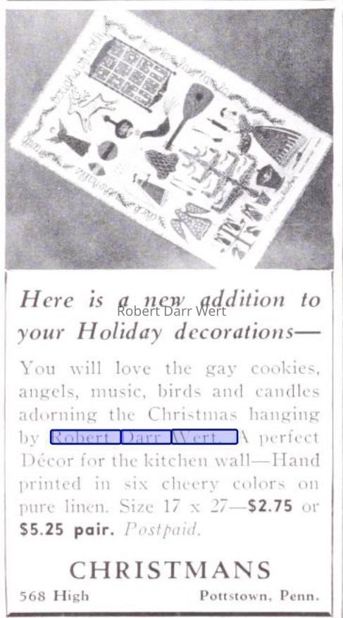 This print was marketed for use as a kitchen towel, wallhanging, or table runner. It appears in an ad for an independent retailer in the October 1953 issue of House & Garden magazine. The opening line of the ad, “Here is a new addition to your holiday decorations —“ possibly indicates this is the year it was introduced.