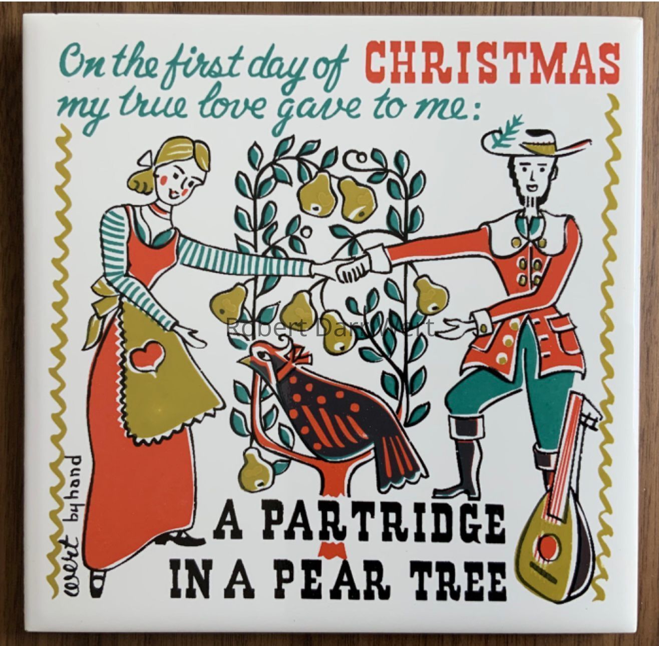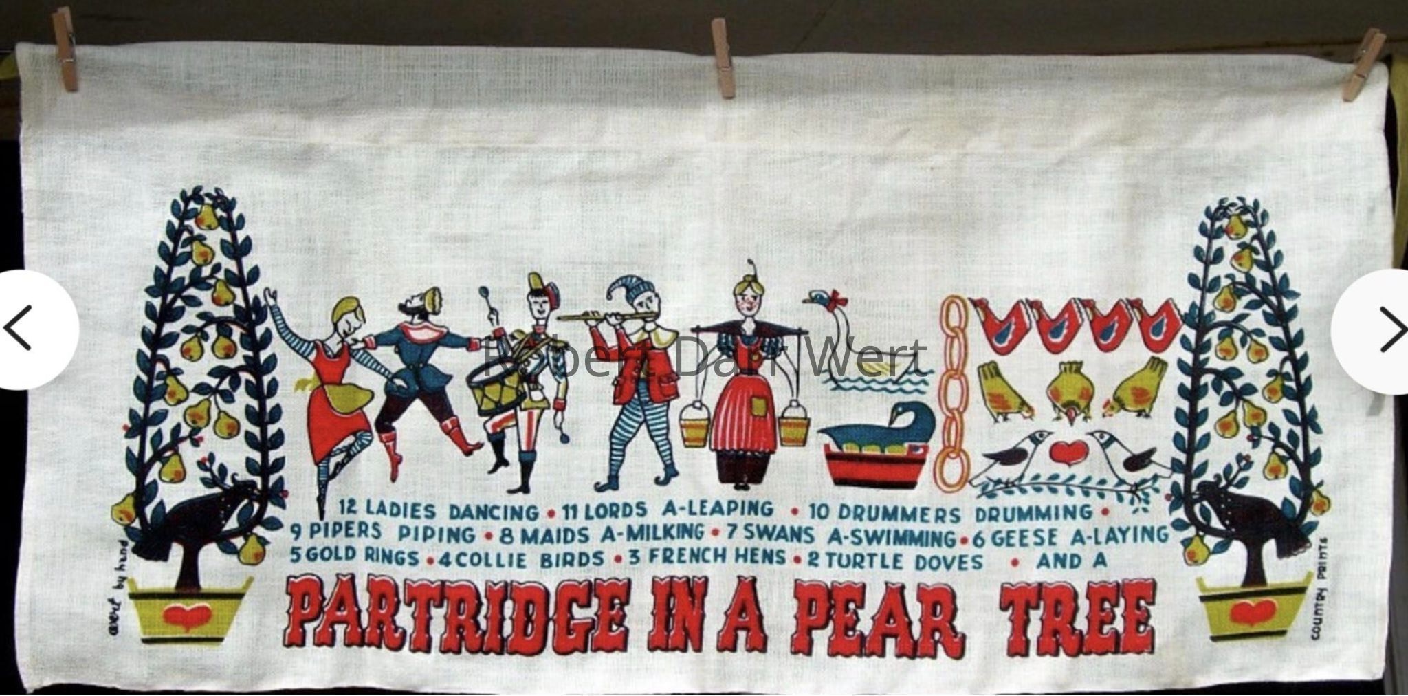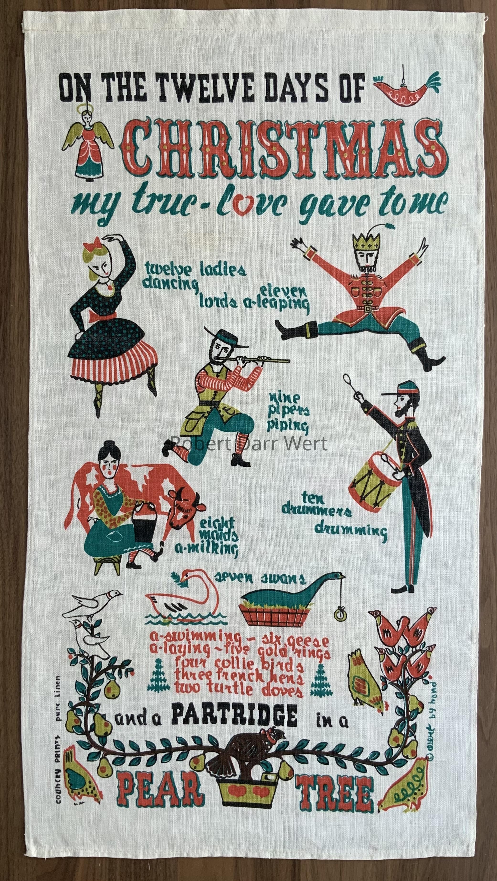 A towel/wallhanging featuring an abbreviated, illustrated version of the traditional English Christmas carol, The Twelve Days of Christmas. The four-color silkscreen print on bleached white linen depicts drawings of the twelve major figures in the carol, as well as Wert’s hand cut text naming each figure.