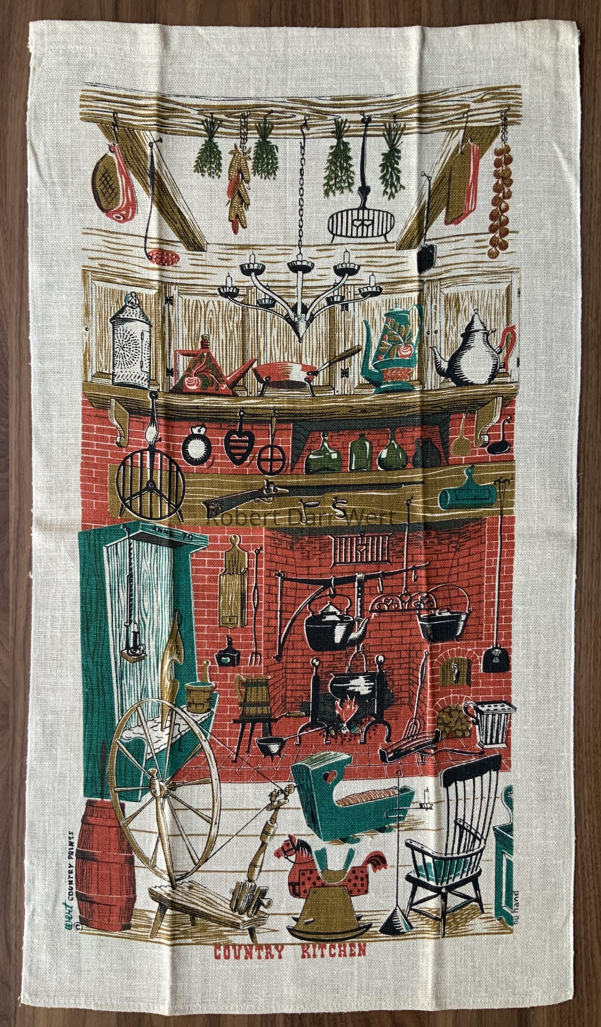 This towel/wallhanging appears on a c.1965 promotional postcard for Bromley & Co. of Boston, Massachusetts, Country Prints’ New England wholesale representative to the gift trade.Made/Created