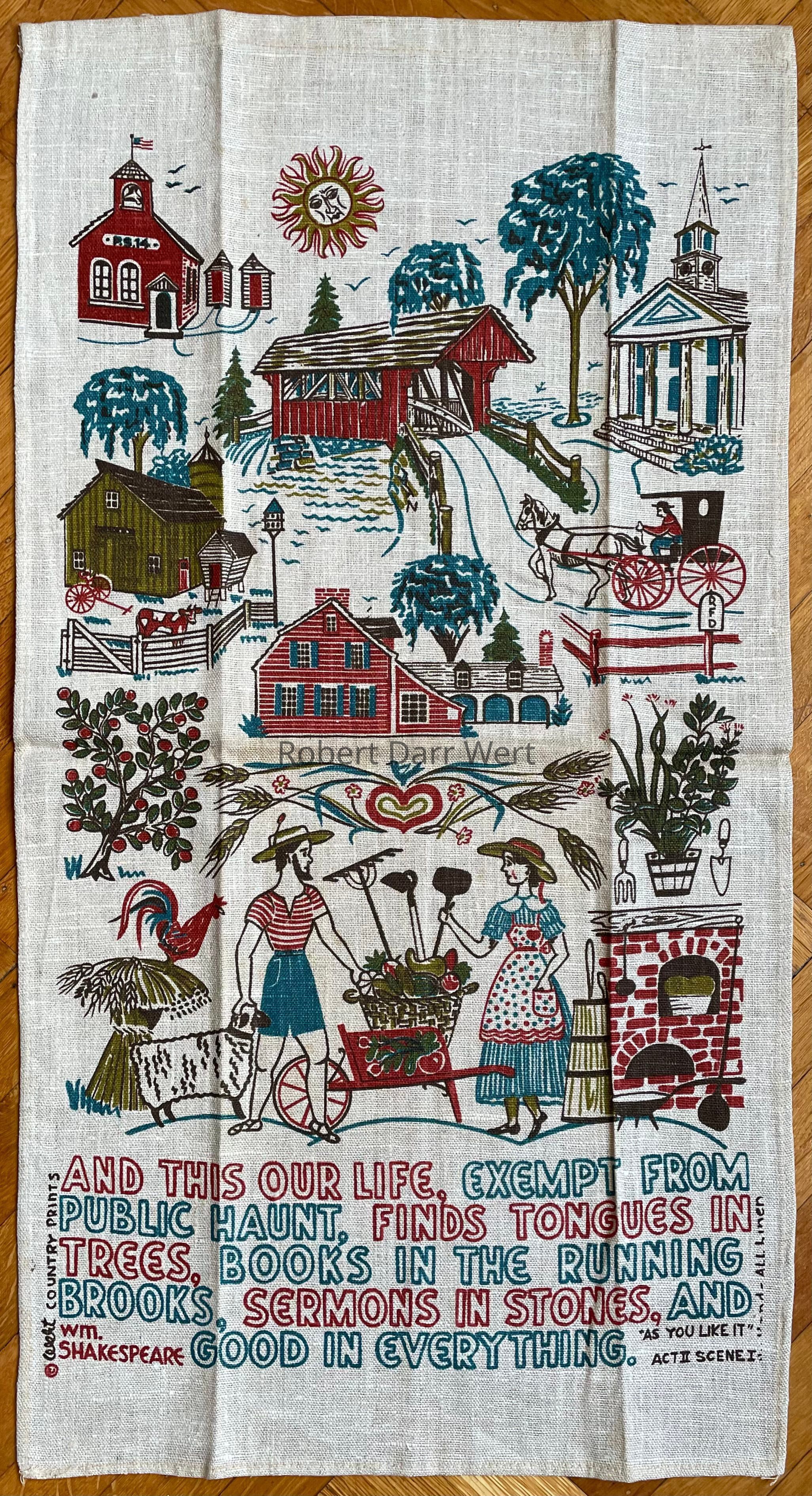 A four-screen/five color silkscreen print on natural linen depicting a country couple with tools of daily work, rural buildings, and a covered bridge. At the base of the composition is a quote from Shakespeare’s “As You Like It”, Act II, Scene 1. The barn, house, church and covered bridge appear to be adapted from buildings at historic Old Sturbridge Village in Massachusetts, an organization for which Country Prints produced at least two custom commissions (a towel/wallhanging and a calendar towel).