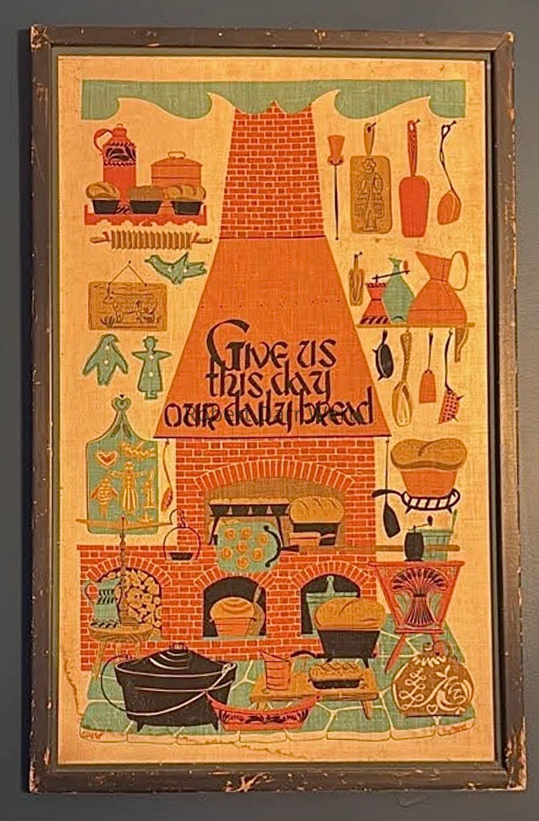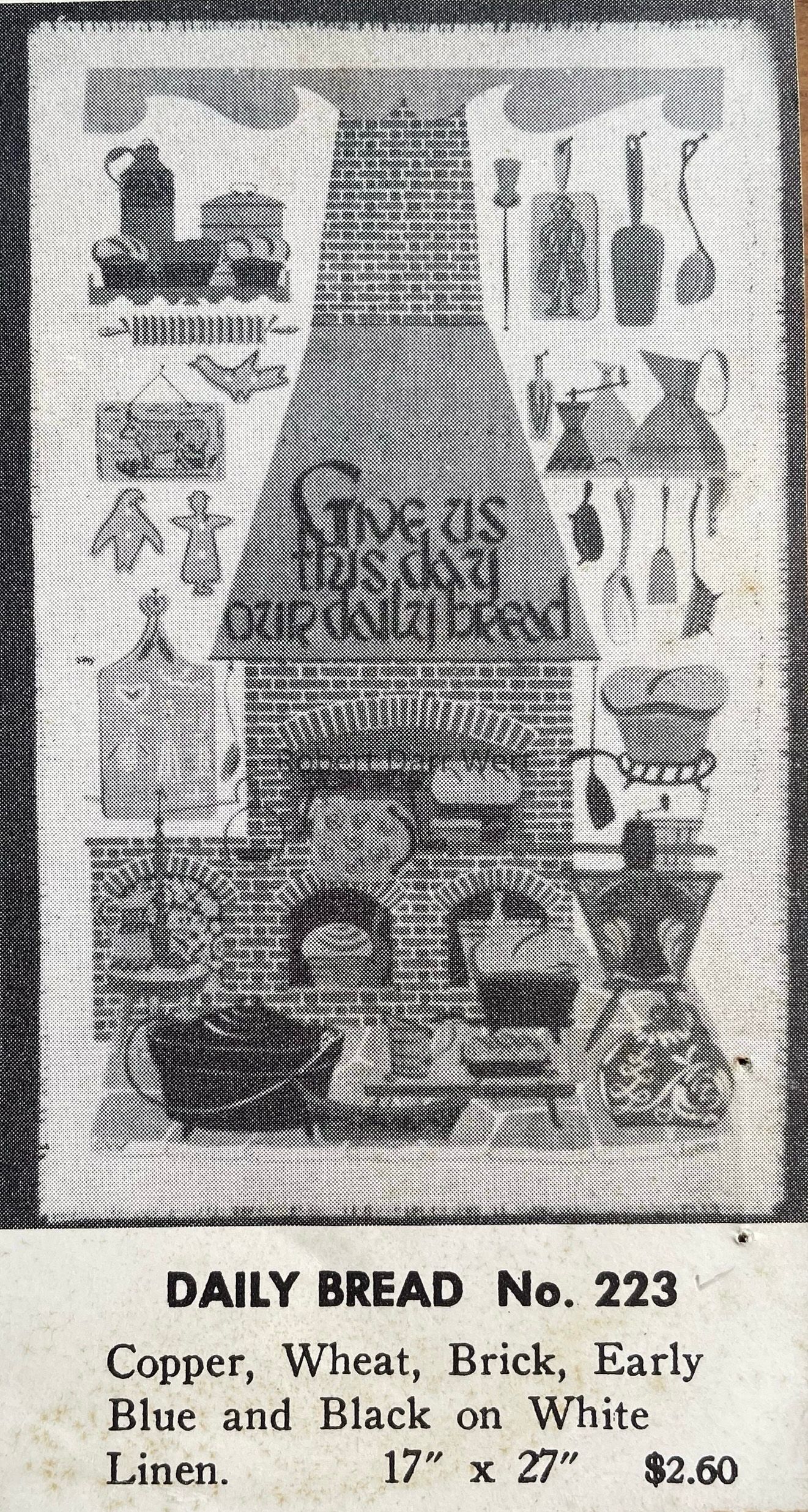 This print was marketed for use as a kitchen towel, wallhanging, or table runner, and appears in the c.1953 brochure “Robert Darr Wert/Country Prints Kitchen Hangings”, and is listed on the Spring 1958 price list.
