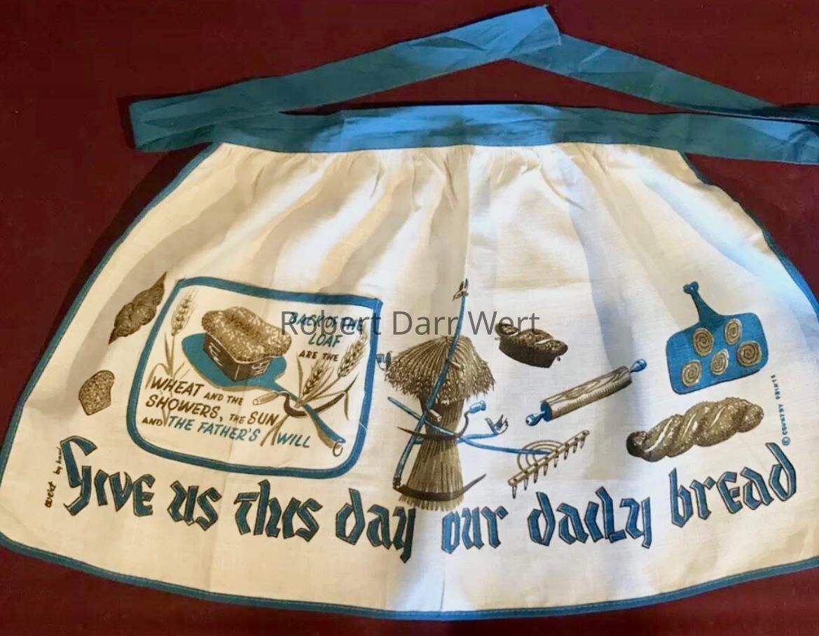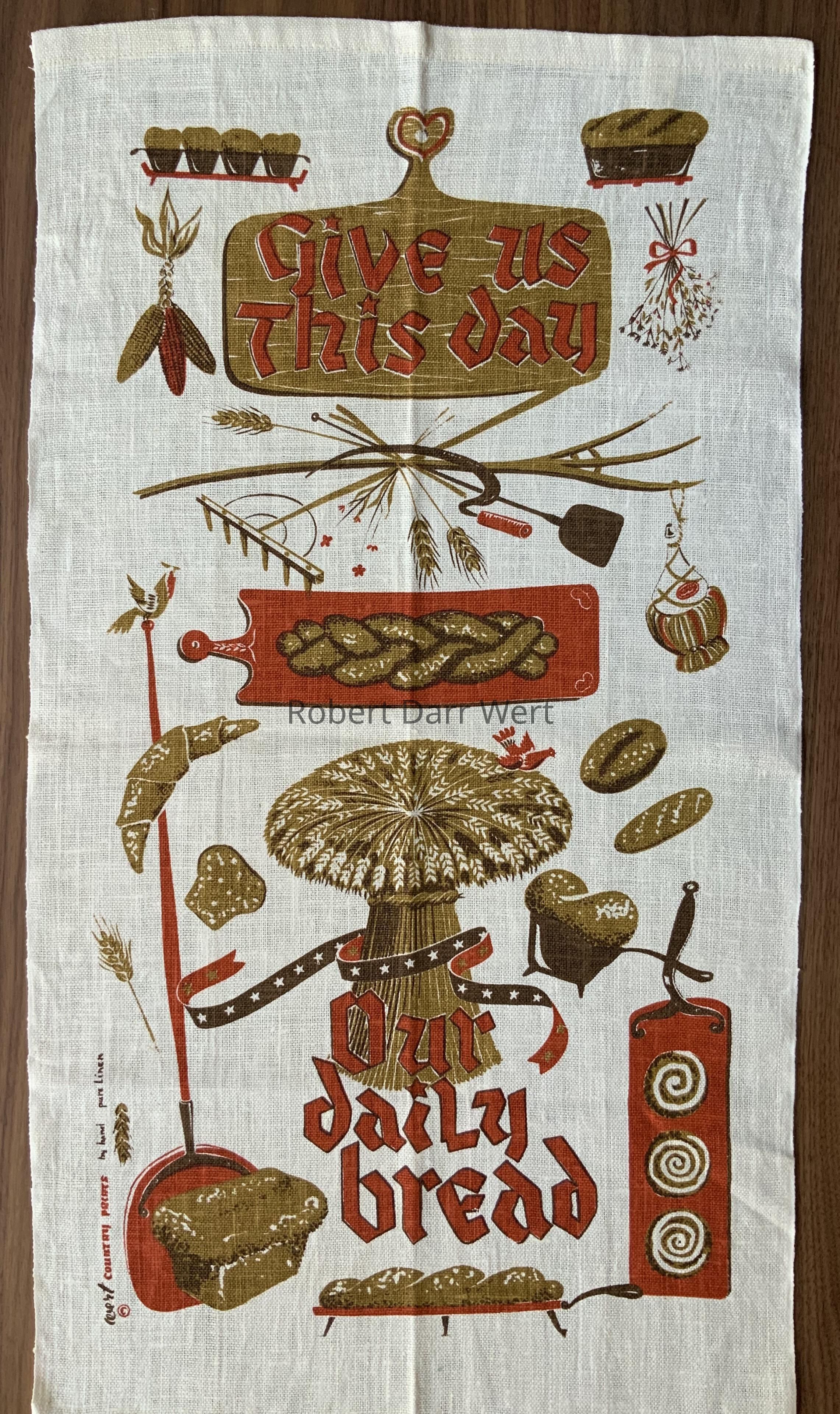 A three-color silkscreen print on natural linen depicting the grains and tools necessary for making breads. Numerous types of bread and roles are illustrated. From the Lord’s Prayer, “Give us This day” appears on a breadboard at top, while “Our daily bread” appears on and below a shock of wheat at the lower section of the composition.