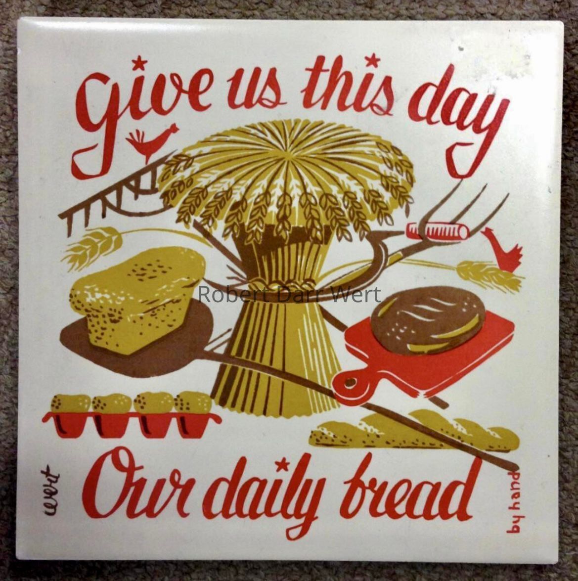 This towel/wallhanging appears in the brochures “Country Prints by Robert Darr Wert and Neighbors”, c.1963 and c.1966.
