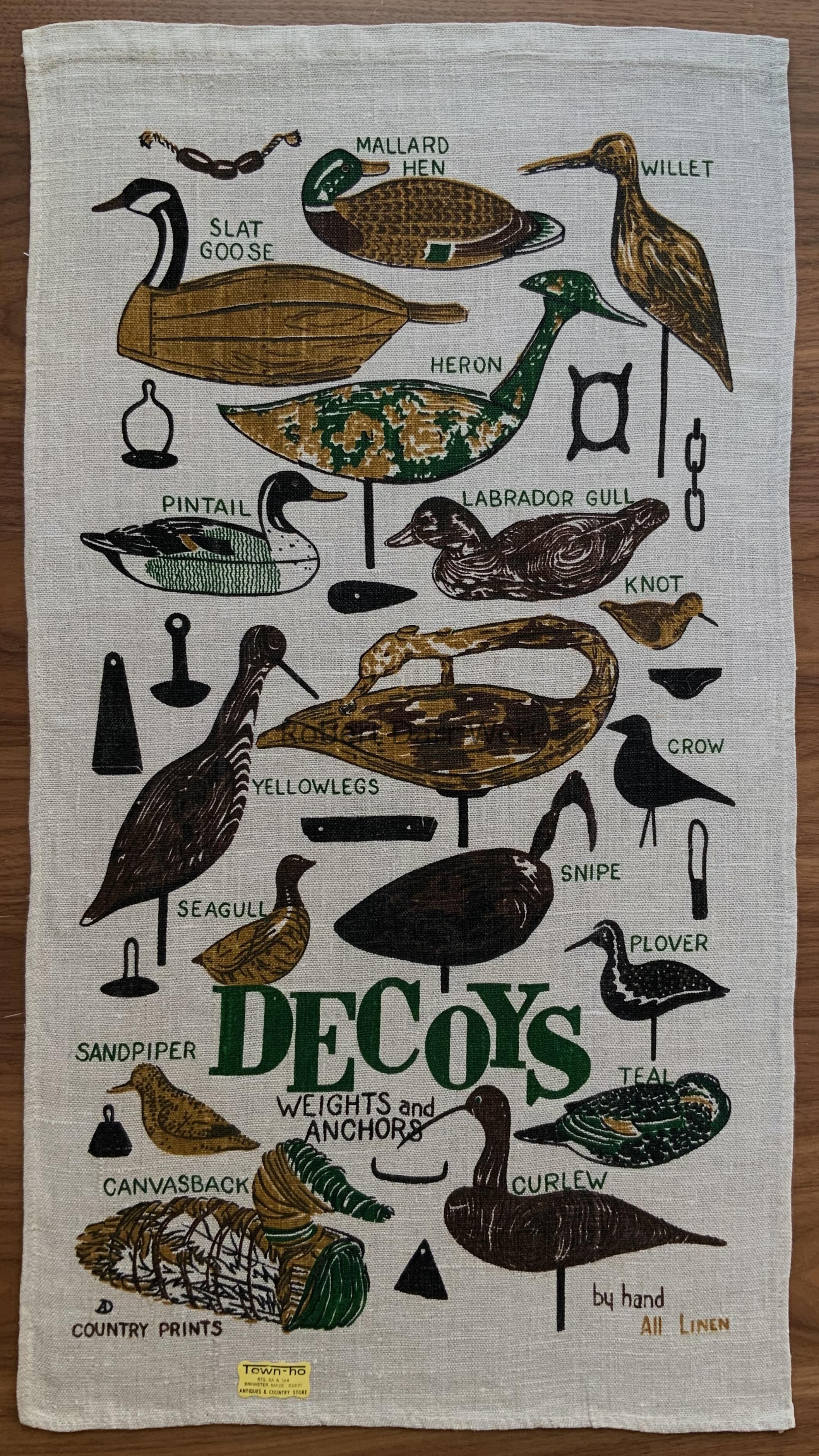 A four-color silkscreen print on natural linen depicting seventeen decoys for hunting waterfowl and other birds, along with the weights and anchors necessary for securing them.