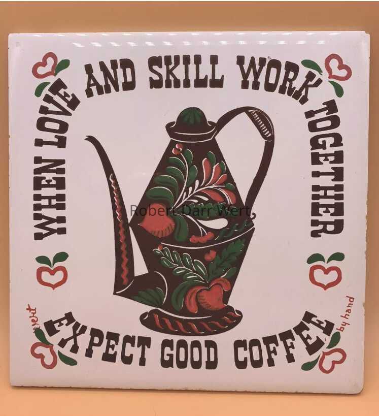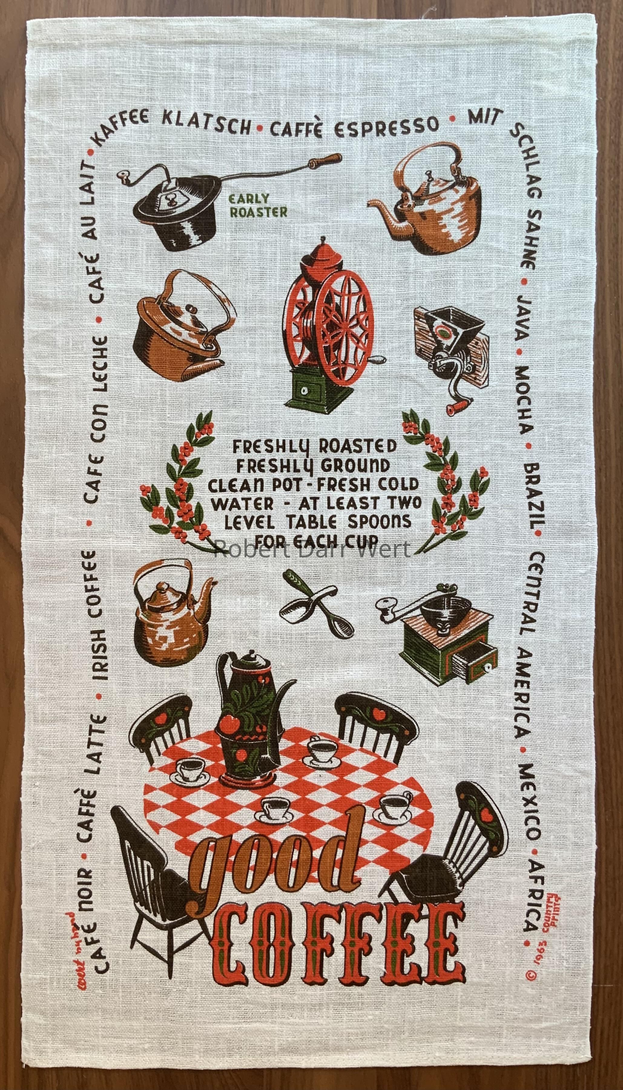 A four-color silkscreen print on off-white linen depicting the cooking tools and instructions for making good coffee. Copper kettles, an early coffee roaster and three types of coffee grinders are placed around rough instructions for making coffee. Below, a table is set for coffee service, with a painted tin coffee pot and four cups full of black coffee. The border names popular coffee drinks as well as countries known for coffee production.