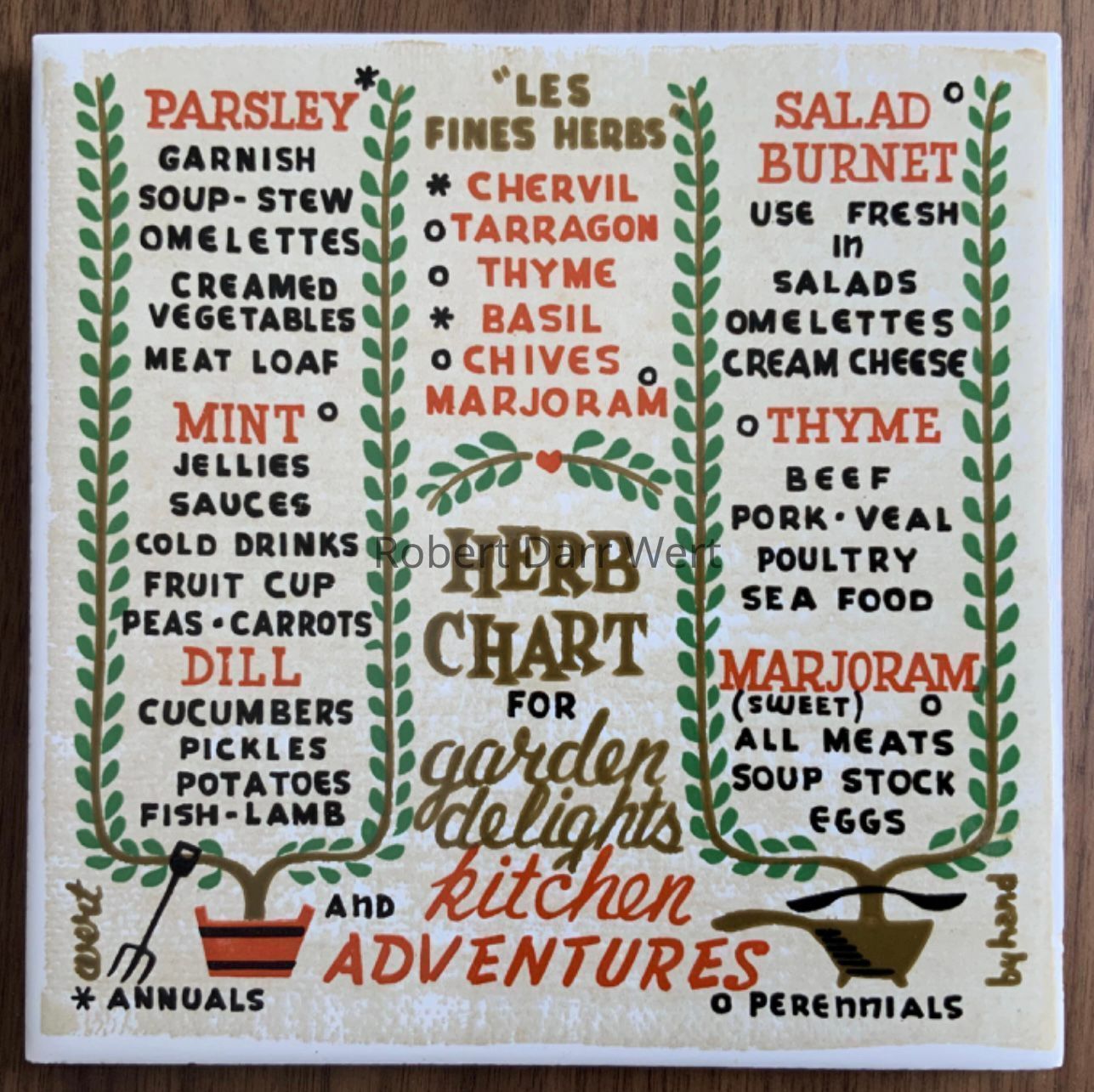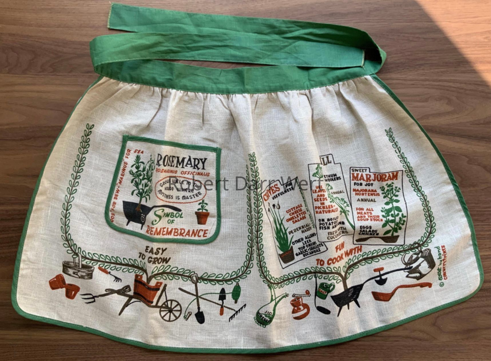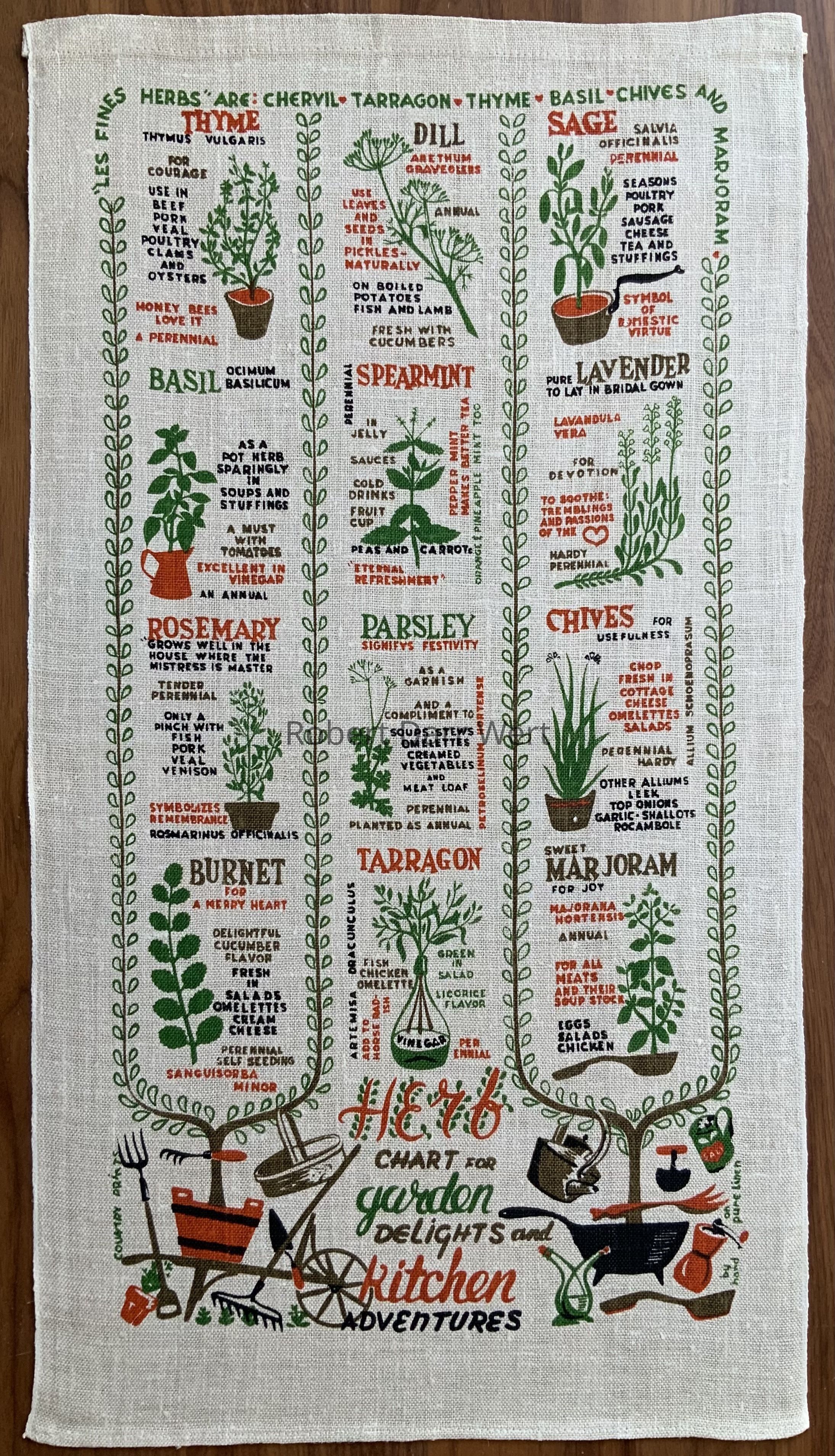 A four-color silkscreen print on natural linen depicting illustrations, descriptions and suggestions for the use of twelve herbs. The three columns of herbs are framed with trailing vines growing from wooden and cast iron containers at the base of the composition. Garden tools and kitchen tools flank the title.