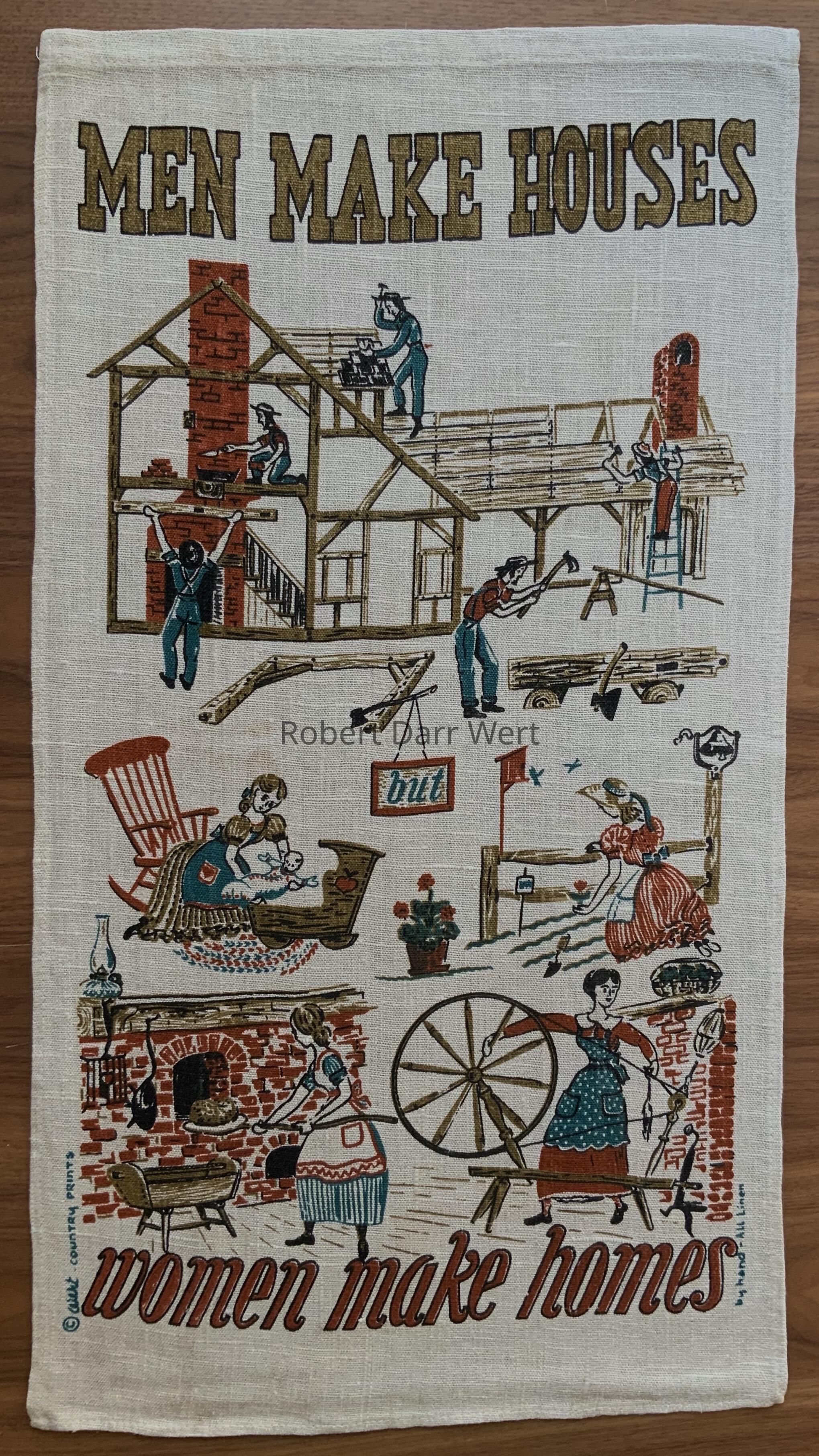 A four-color silkscreen print on natural linen with illustrations to enhance the maxim, “Men make houses, but women make homes”.