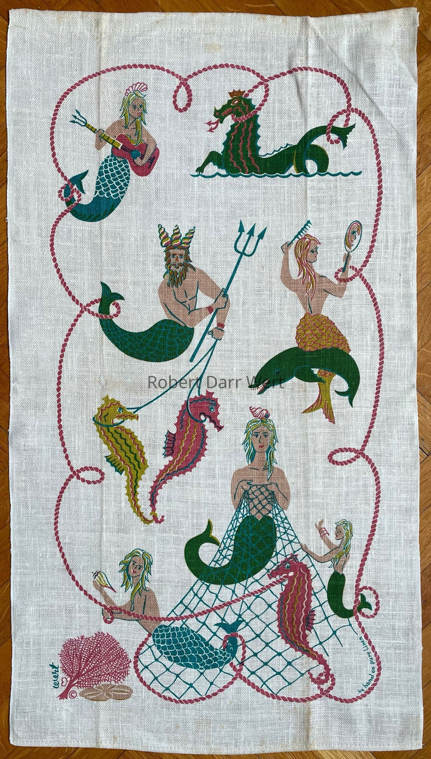 A towel/wallhanging with a four-screen/five-color silkscreen print on white linen depicting King Neptune, five mermaids, and several sea creatures contained within a border of pink rope.Made/Created