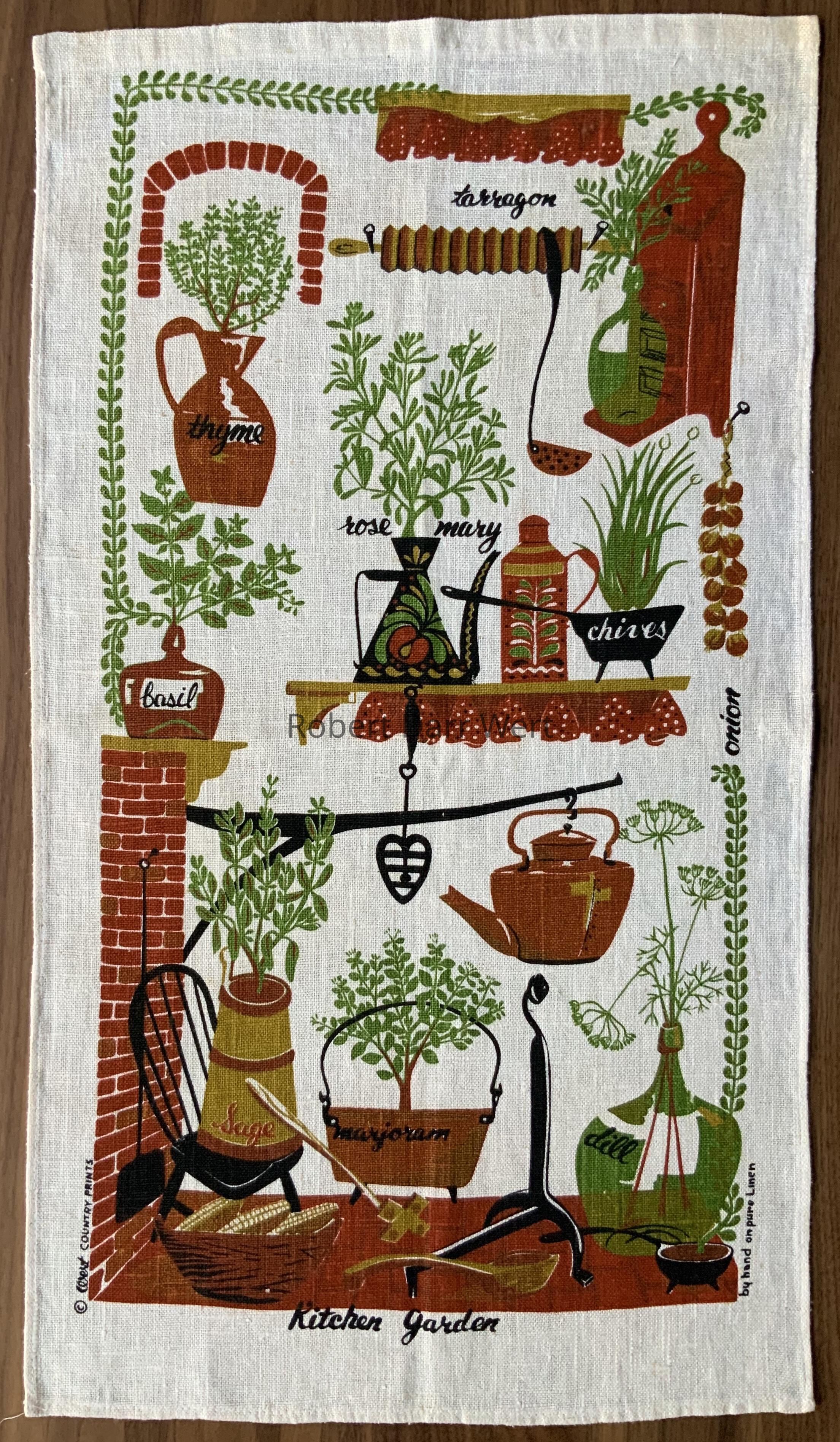 A four-color silkscreen print on off-white linen depicting an implied colonial kitchen with herbs and tools for cooking. Herbs are portrayed as living plants and cuttings, planted and/or kept in water in glass bottles, kettles, jugs, pans and woodware. Herbs are rendered in silhouette and are identifiable, but also labeled for identification. A trailing vine frames three sides of the composition, one beginning in a glass bottle and the second in a footed cast iron pot.