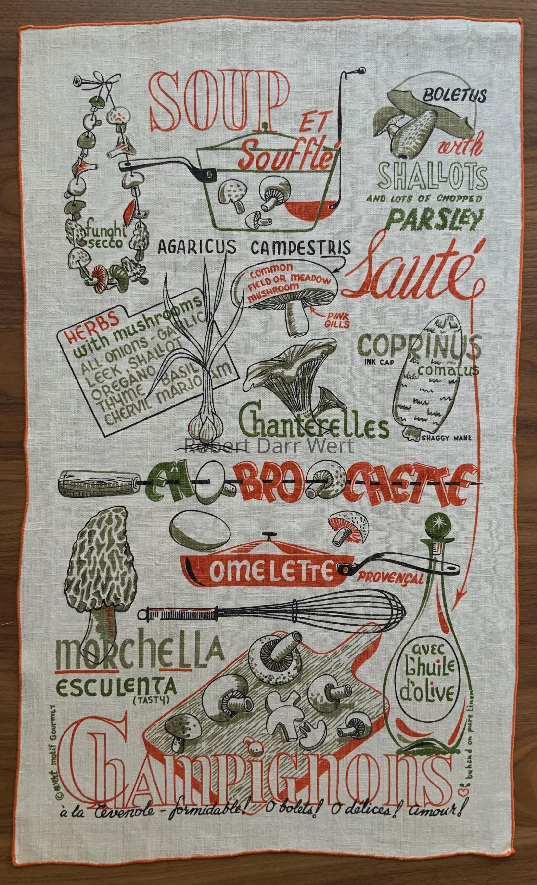 A four-color silkscreen print on off-white linen depicting a variety of edible mushrooms, herbs to pair with them, suggestions for cooking, and the tools for cooking them.