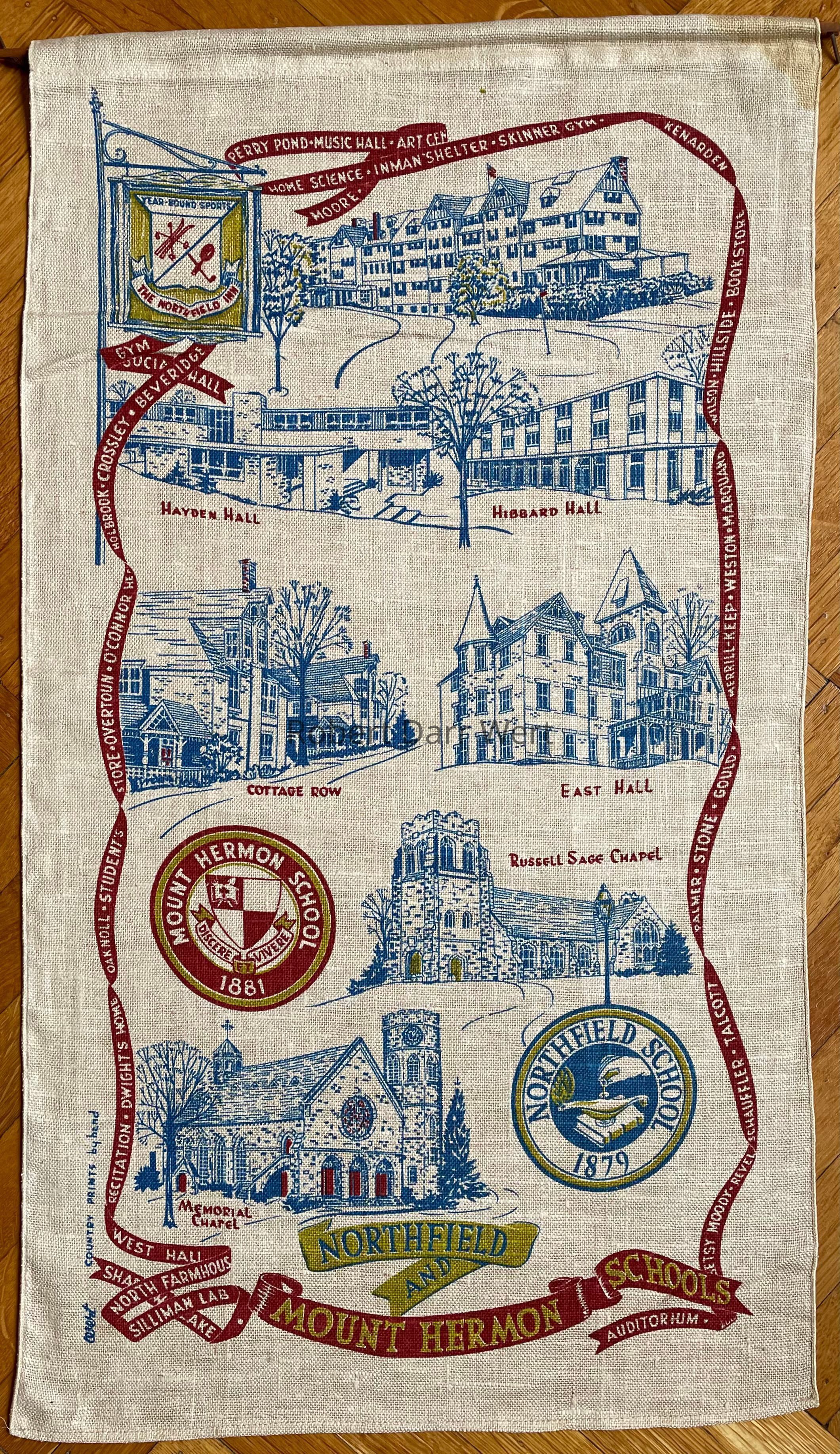 A three-color silkscreen print on off-white linen depicting the school crests and campus buildings of the Northfield and Mount Hermon Schools (now Northfield Mount Hermon School) of Gill, Massachusetts; see web links. School landmarks not pictured are included by name on the red banner bordering the composition. This print was likely produced as a fundraiser for the school.