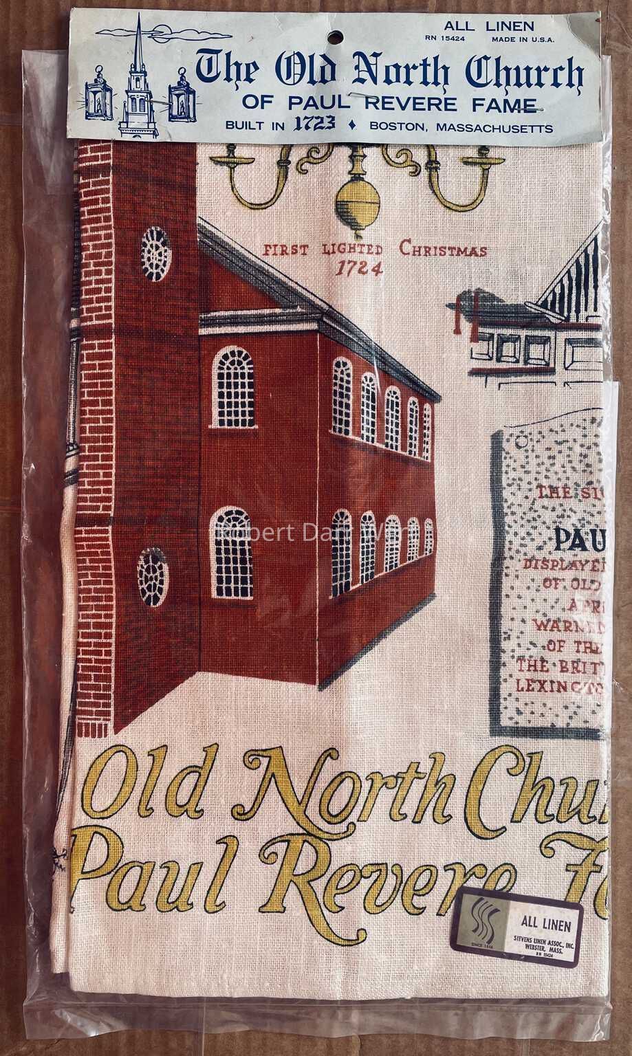 Country Prints produced this print for a number of years and it was one of 61 designs sold to Stevens Linens Associates, Inc., of Dudley Massachusetts, in January 1969. Stevens continued to produce this print without the Wert/Country Prints identifiers for Bromley & Co. as well as the Old North Church souvenir shop. An example in Stevens’ packaging can be seen below.