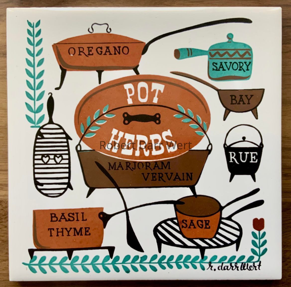 A four-color silkscreen print on off-white linen depicting ten herb plants potted in labeled kitchen vessels or bare-rooted. Cooking tools and a brick oven with an iron door complete the composition. “HERBS POUR LE POT” (herbs for the pot) labels the iron oven door.